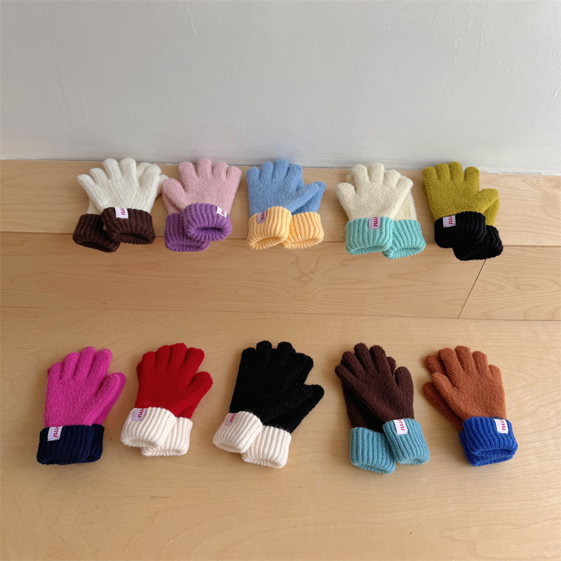 韓国版の子供のニットの手袋の秋冬の男女の子供の騎乗は色にぶつかってベルベットの保温のタッチパネルは毛糸の手袋を指します。