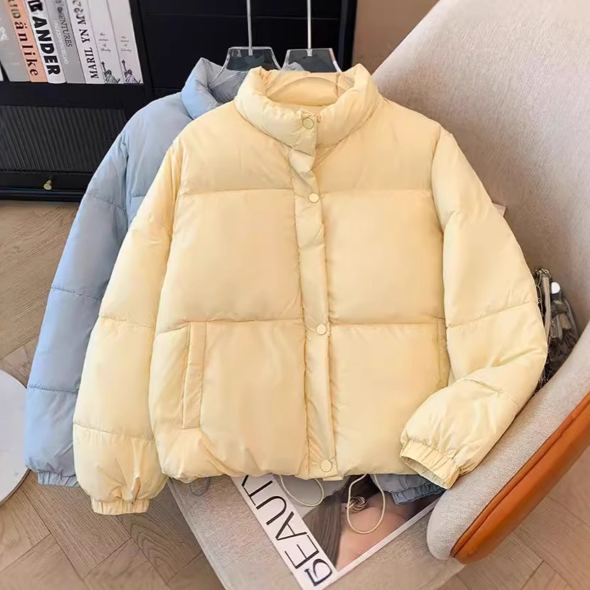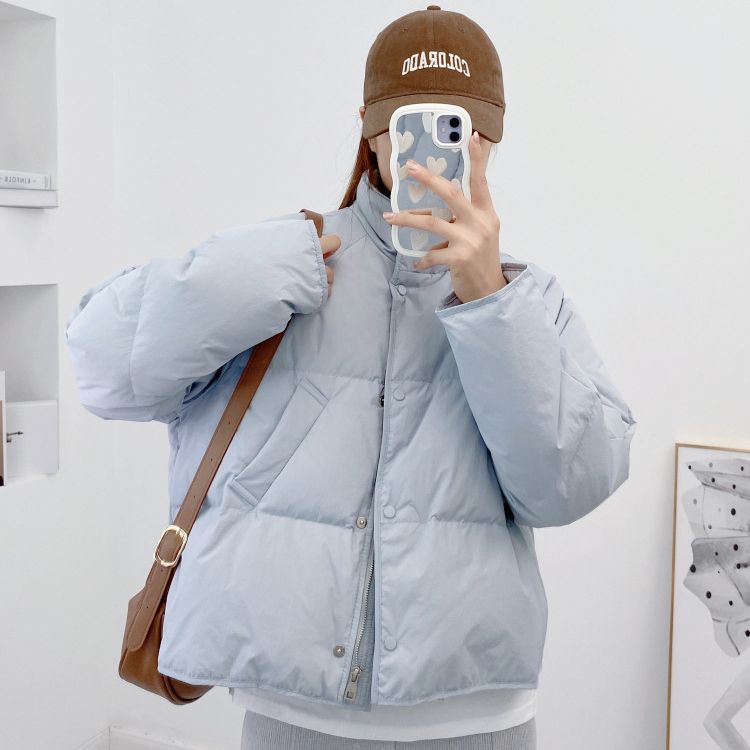 ミルキーブルーのダウンコットンジャケット レディース ショート丈 2025年新作 韓国風 小柄さん向け 中綿ジャケット パンコート 冬