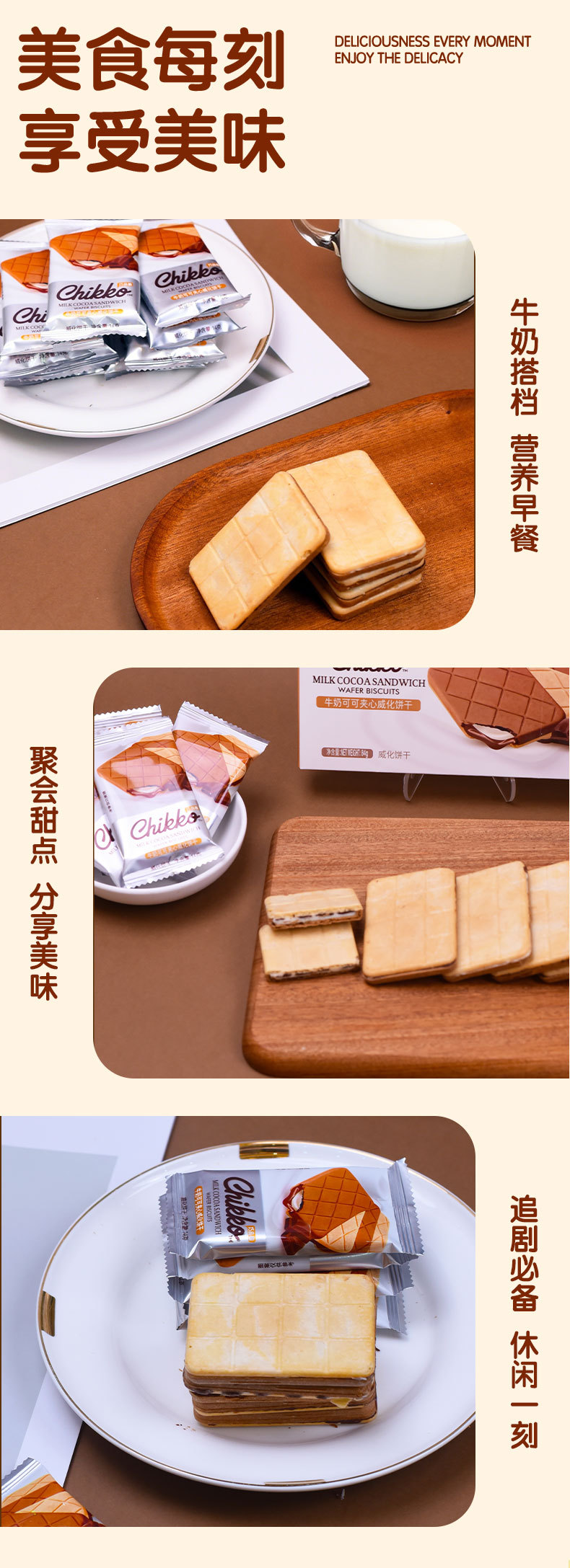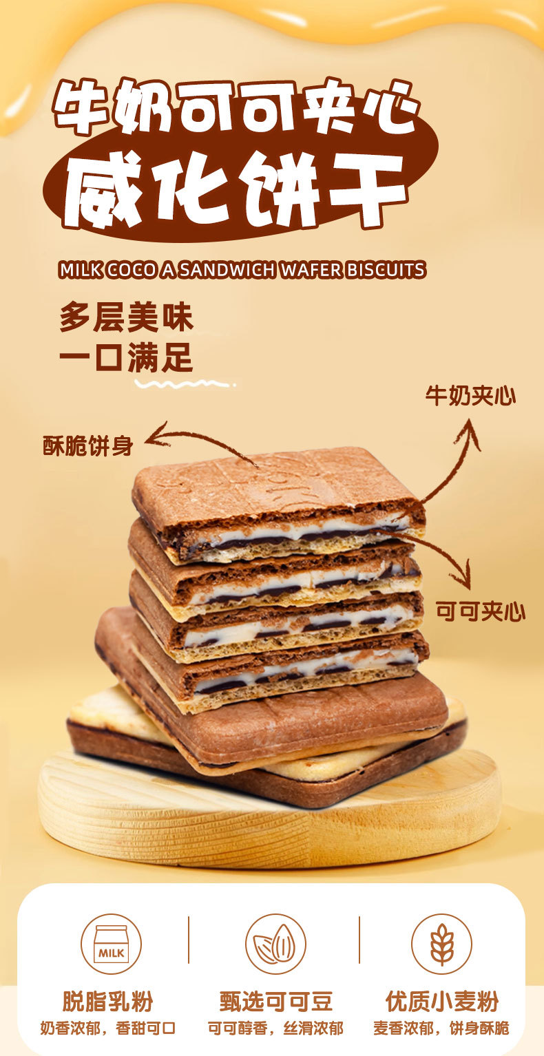 厂家直销外贸爆款牛奶可可夹心饼干薄脆巧克力威化饼干休闲小零食