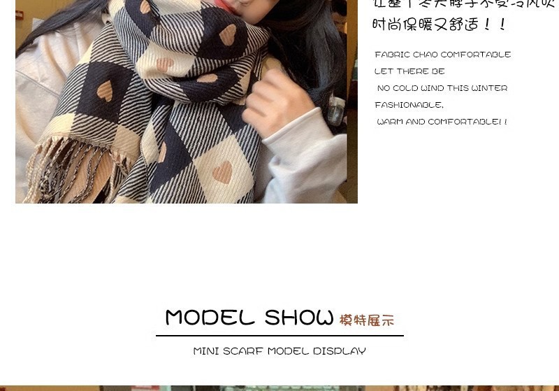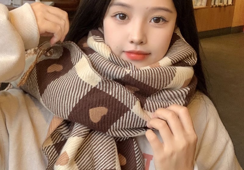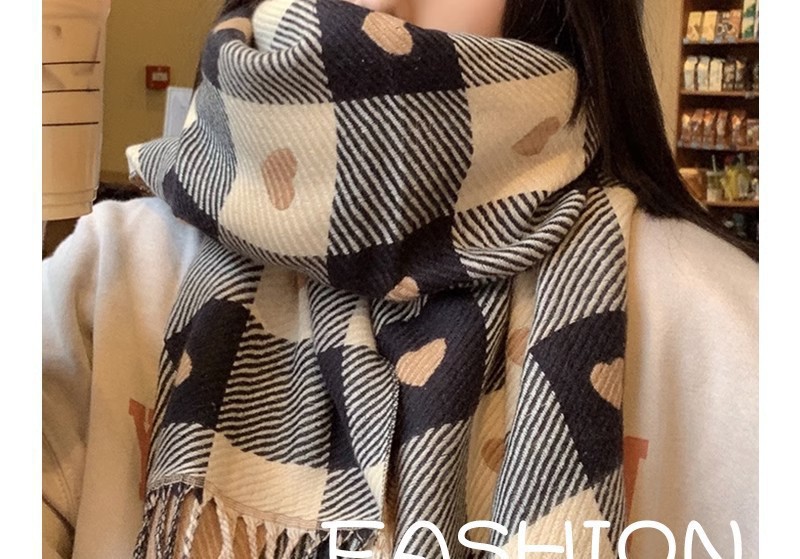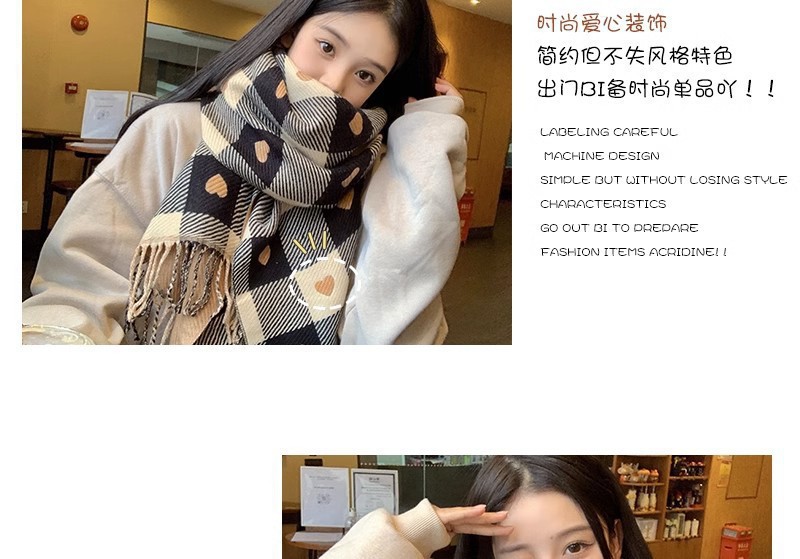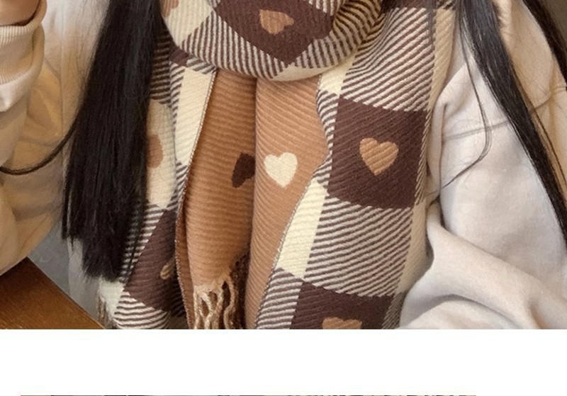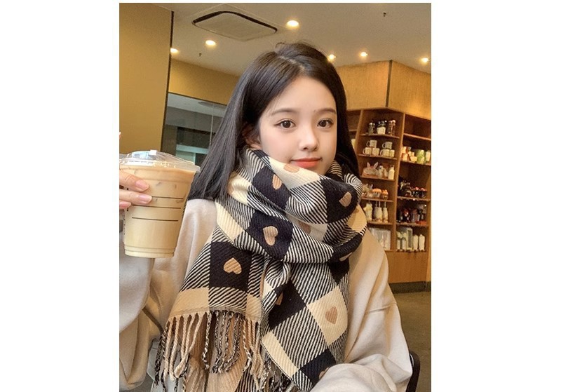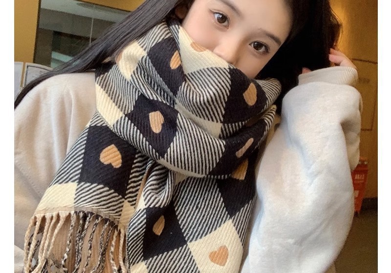 2025冬季新款仿羊绒围巾女爱心格子加厚流苏围脖韩版时尚百搭披肩