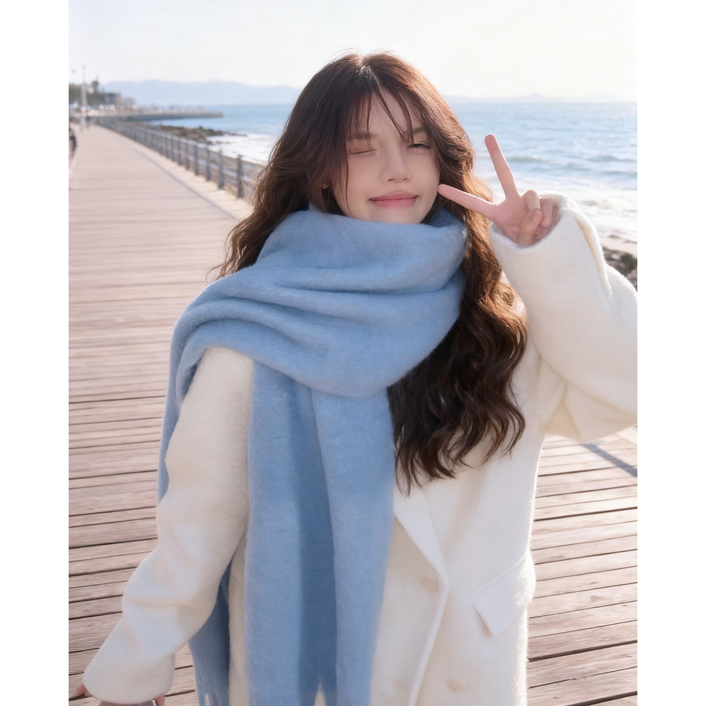 韩国秋冬新品围巾女浅蓝色松保暖加厚围脖纯色马海毛围巾跨境代发