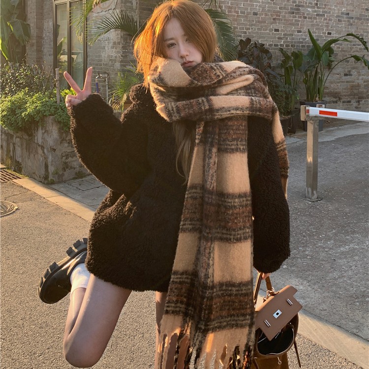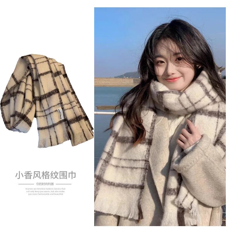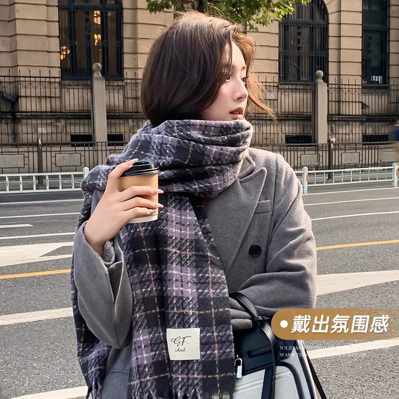 2025韩系秋冬氛围感复古仿羊绒围巾女学生百搭格子围脖保暖披肩