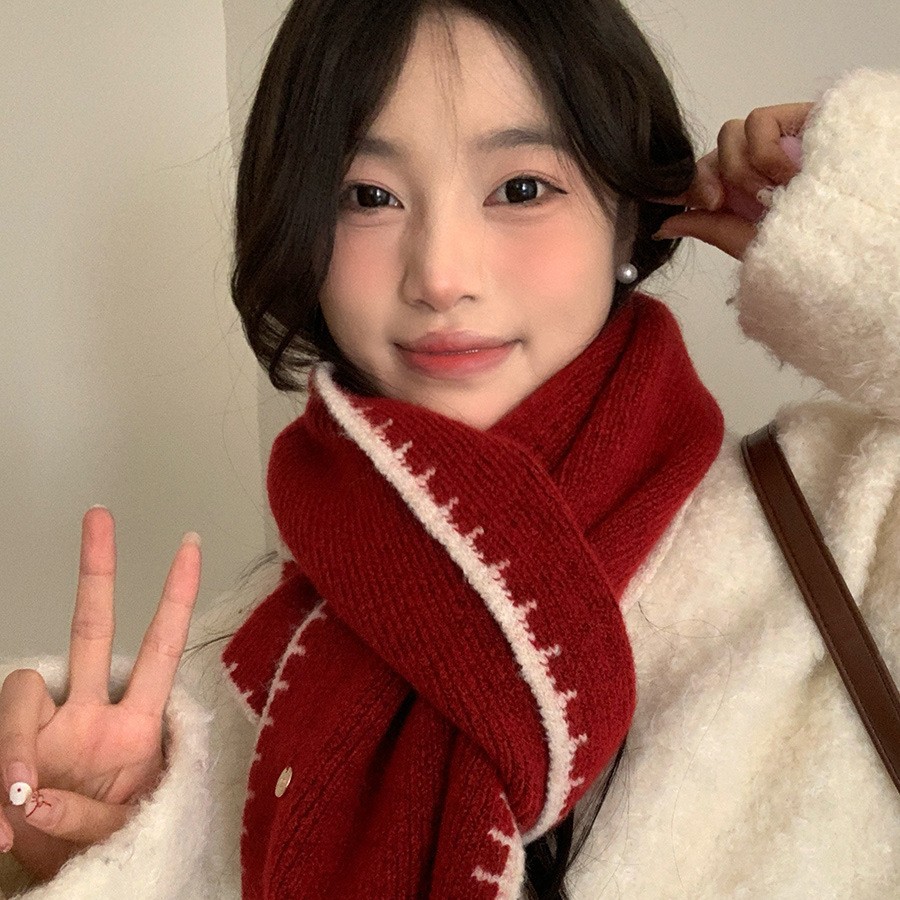 红色高级感围巾女2025新款冬季圣诞保暖针织毛线简约百搭防寒围脖