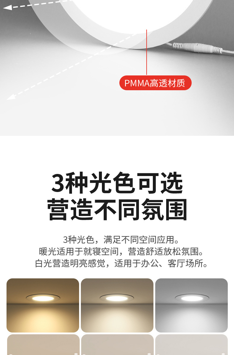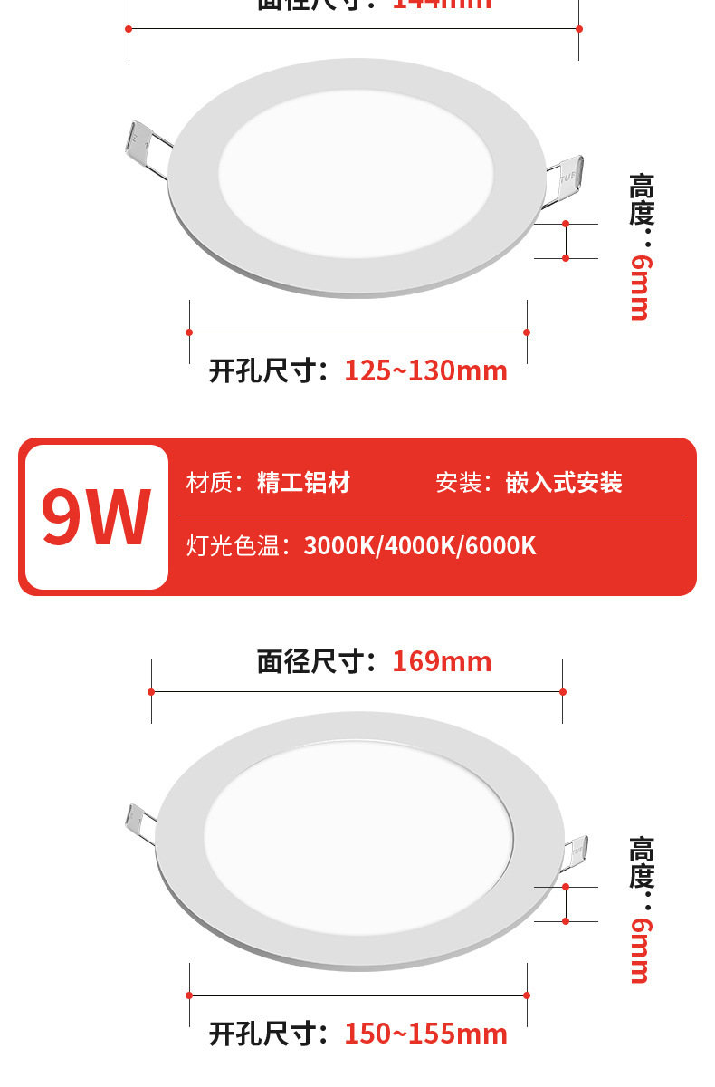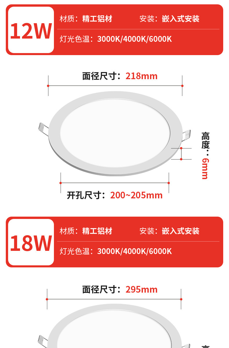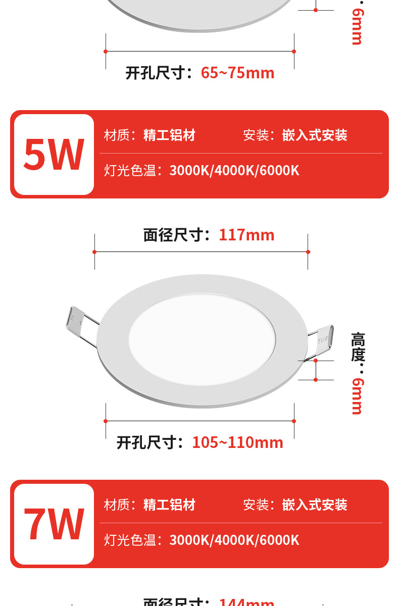 灯光颜色 超薄圆形-5W开孔6.5-7.5cm,超薄圆形-7W开孔10.5-11cm,超薄圆形-9W开孔13-13.5cm,超薄圆形-12W开孔15-16cm,超薄圆形-18W开孔20-21cm,超薄圆形-24W开孔27.5-28.5cm,超薄方形-5W开孔6.5-7.5cm,超薄方形-7W开孔10.5-11cm,超薄方形9W开孔13-13.5cm,超薄方形12W开孔15-16cm,超薄方形18W开孔20-21cm,超薄方形24W开孔27.5-28.5cm
