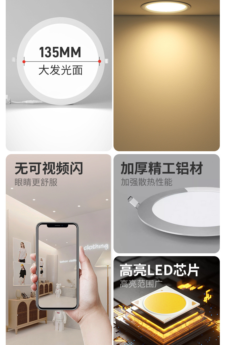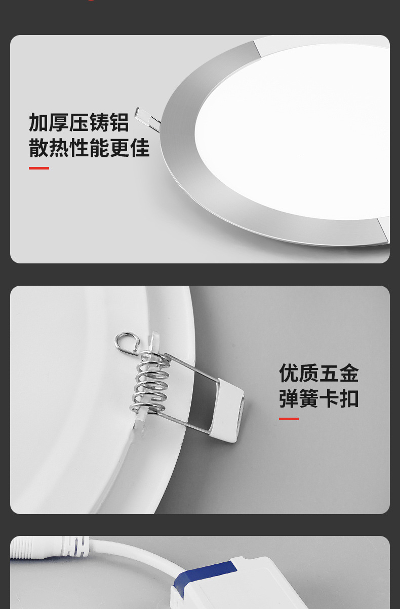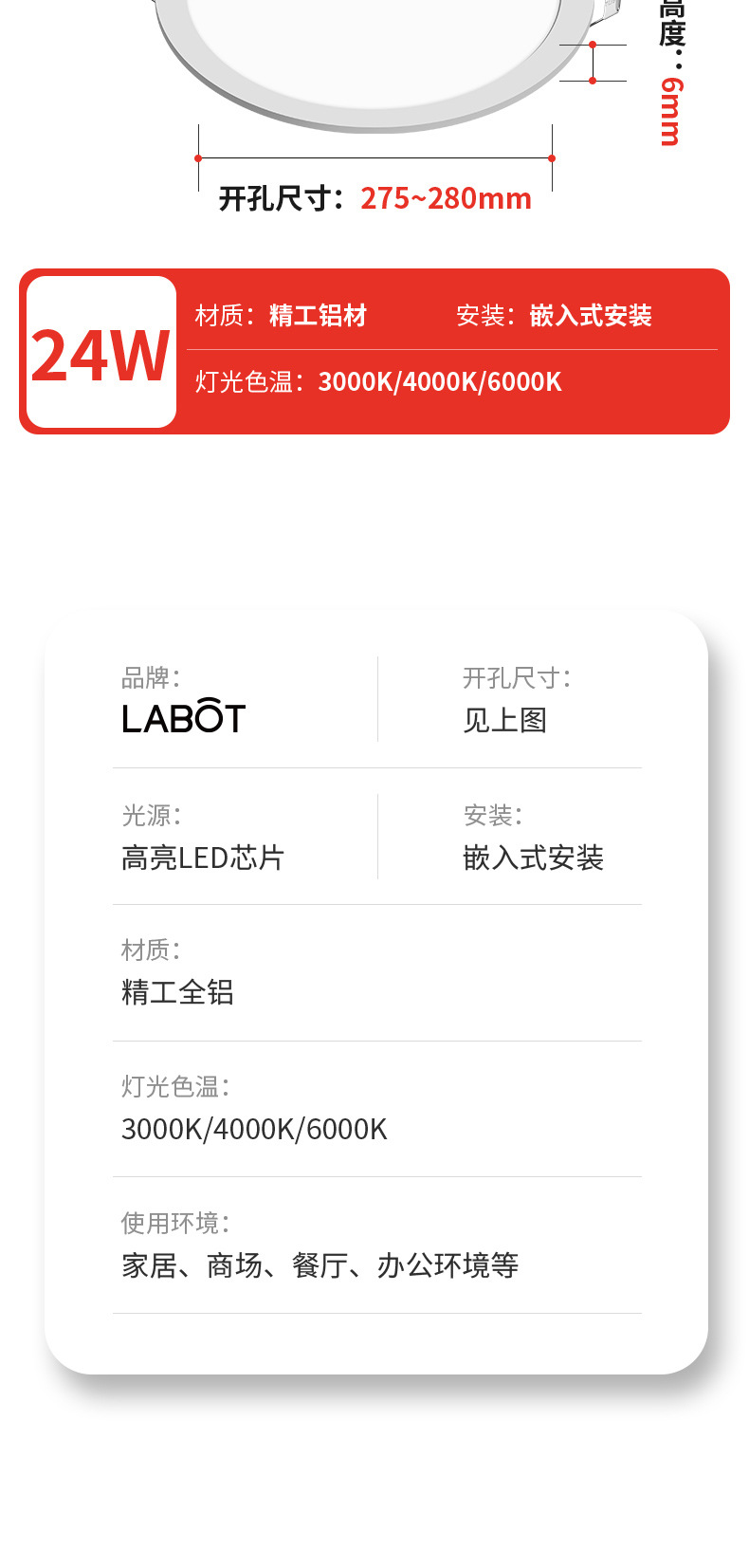 灯光颜色 超薄圆形-5W开孔6.5-7.5cm,超薄圆形-7W开孔10.5-11cm,超薄圆形-9W开孔13-13.5cm,超薄圆形-12W开孔15-16cm,超薄圆形-18W开孔20-21cm,超薄圆形-24W开孔27.5-28.5cm,超薄方形-5W开孔6.5-7.5cm,超薄方形-7W开孔10.5-11cm,超薄方形9W开孔13-13.5cm,超薄方形12W开孔15-16cm,超薄方形18W开孔20-21cm,超薄方形24W开孔27.5-28.5cm