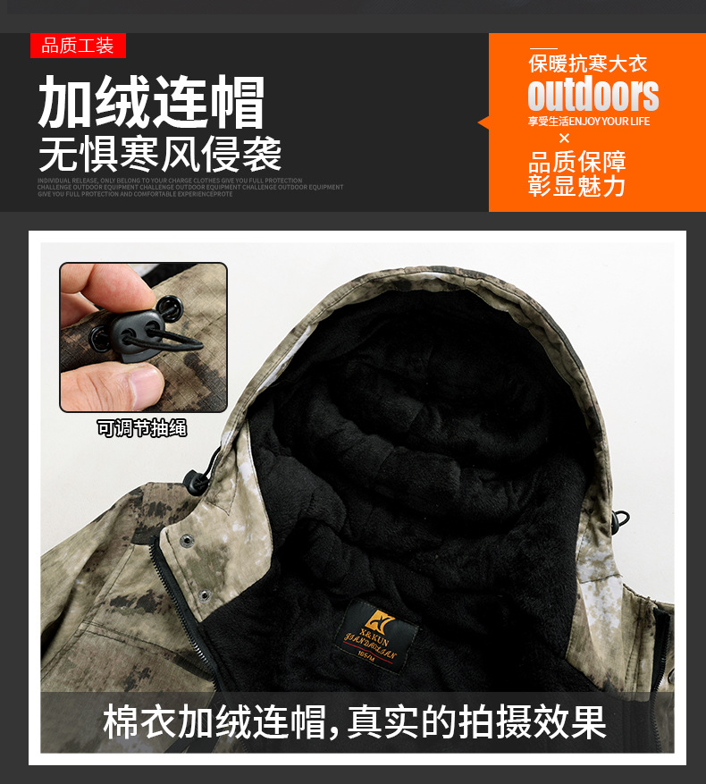 冬季加棉加厚棉衣迷彩棉袄绗缝加棉内里帽子可拆卸网格面料男多兜