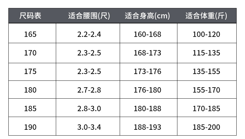 尺码 165码【 90-110斤】,170码【110-130斤】,175码【130-150斤】,180码【150-170斤】,185码【170-190斤】,190码【190-210斤】
