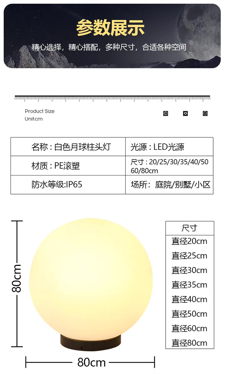 外形尺寸 9876-20CM柱头灯白球接电-暖光,9876-20CM柱头灯白球太阳能款-三色光,9876-25CM柱头灯白球接电-暖光,9876-25CM柱头灯白球太阳能-三色光,9876-30CM柱头灯白球接电-暖光,9876-30CM柱头灯白球太阳能-三色光,9876-40CM柱头灯白球接电-暖光,9876-40CM柱头灯白球太阳能-三色光,9876-50CM柱头灯白球接电-暖光,9876-50CM柱头灯白球太阳能-三色光,9876-60CM柱头灯白球接电-暖光