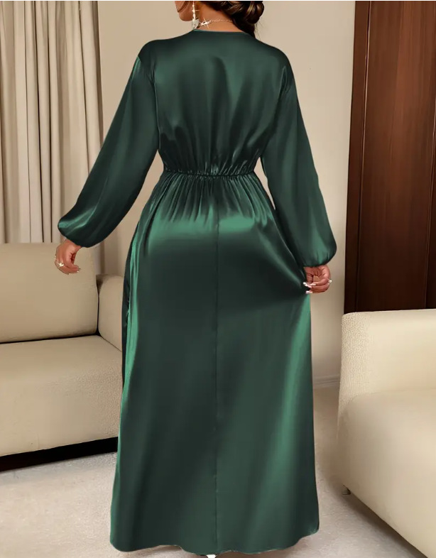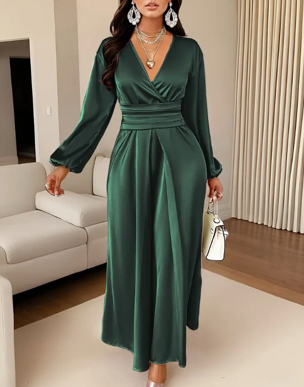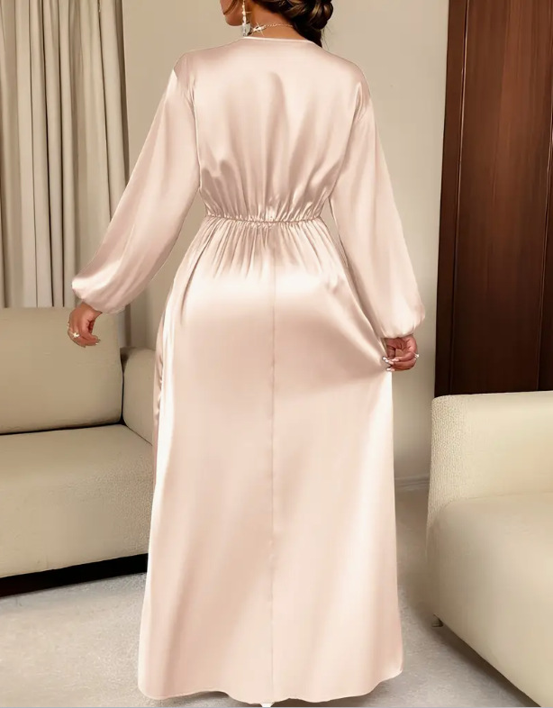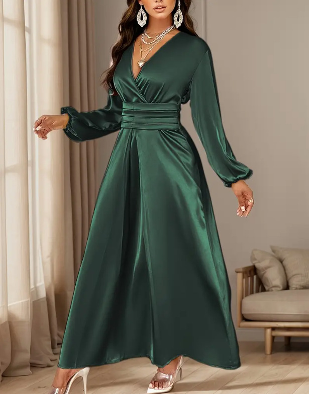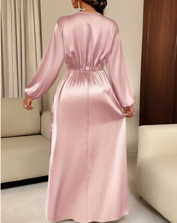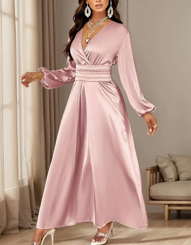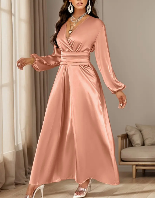 Loriya柔美收腰系带两穿连衣裙,2025欧美迪拜优雅缎面长裙LR588