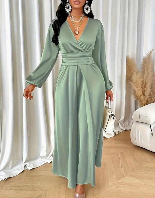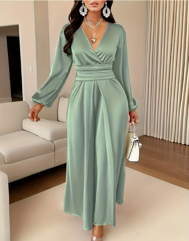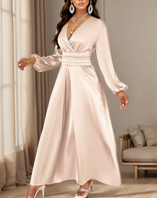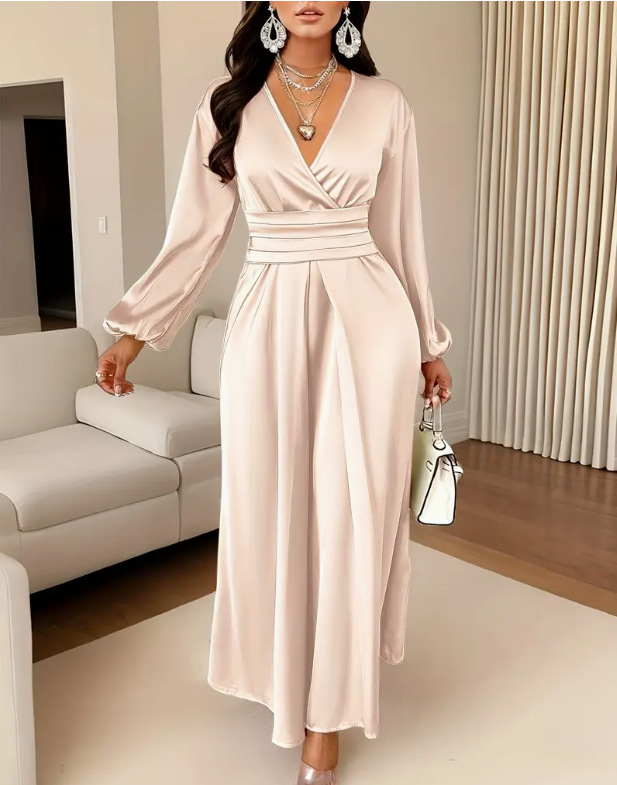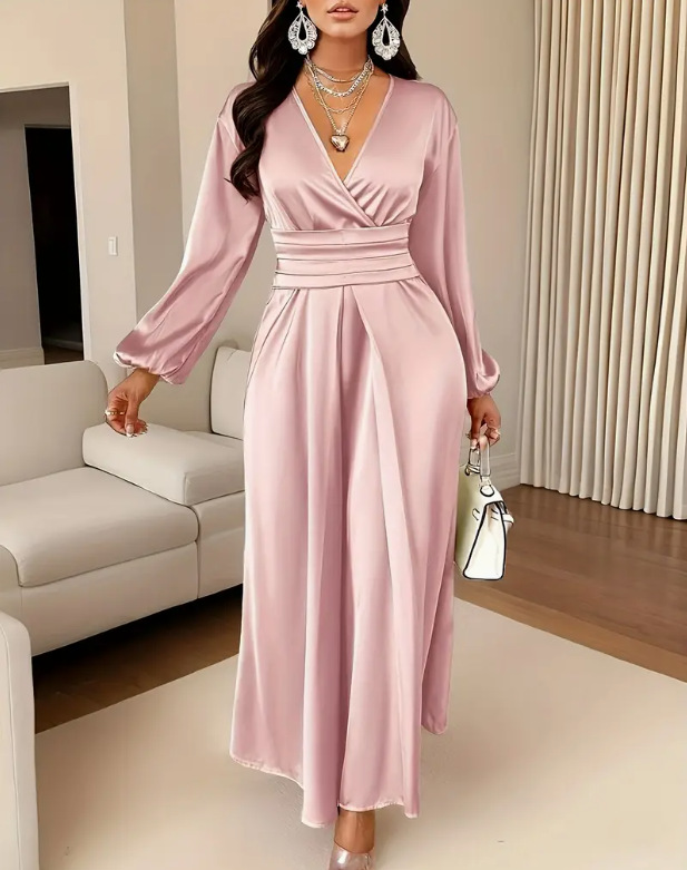2026年春秋の新作韓国風シックなデザインセンスの高い、ウエストシェイプで着痩せ効果のあるVネックロングワンピースレディース