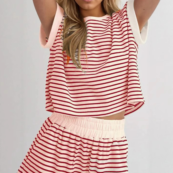 2025 ヨーロッパとアメリカのクロスボーダー夏甘いカジュアル半袖ショーツラウンドネックストライプコントラストカラースポーツスーツ女性のための