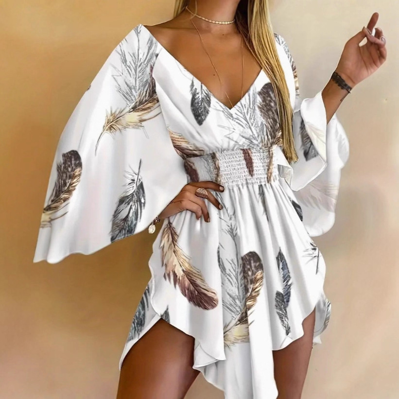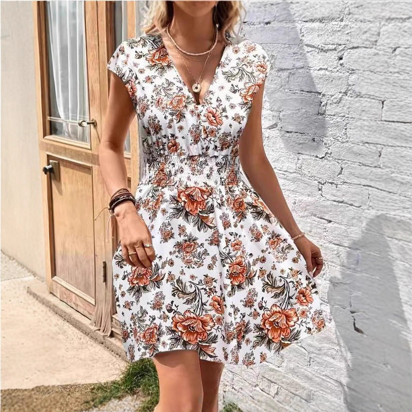 2025 ヨーロッパとアメリカのクロスボーダー Amazon 婦人服夏の新しい気質カジュアルディープ V ネックプリント痩身ドレス
