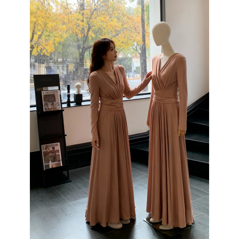 法式温柔风V领长袖连衣裙女2025秋冬新款收腰褶皱高级感气质长裙