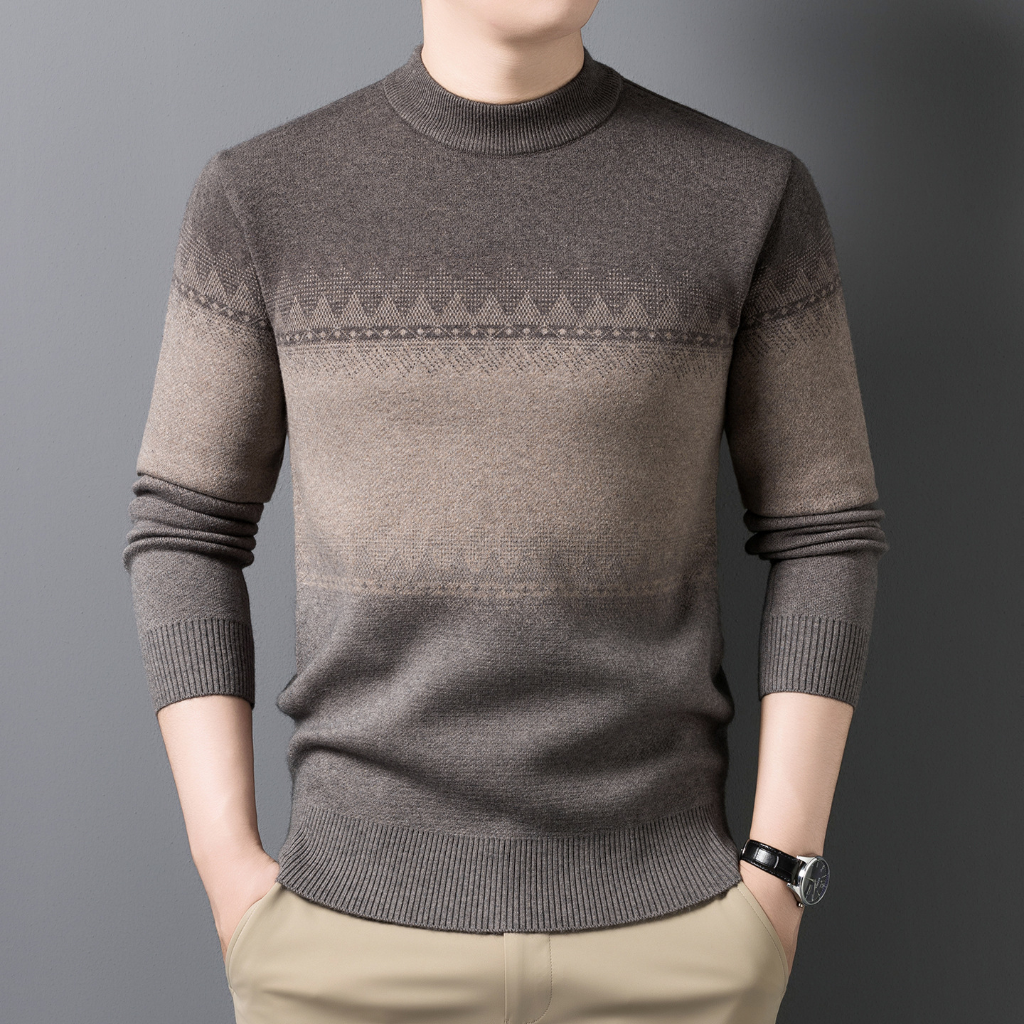 男士高品针织衫中年冬季简约百搭绵针织毛衣加厚条纹圆领休闲装