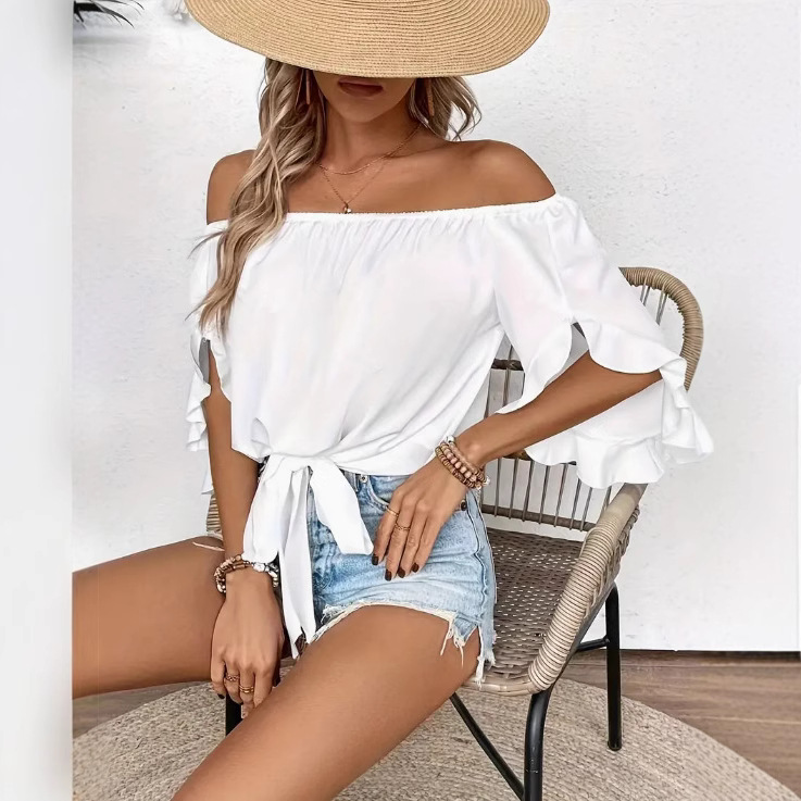 ヨーロッパとアメリカのクロスボーダーレディースワンショルダーネックオフショルダーフレア七分袖カジュアルレースアップリボンルーズトップ