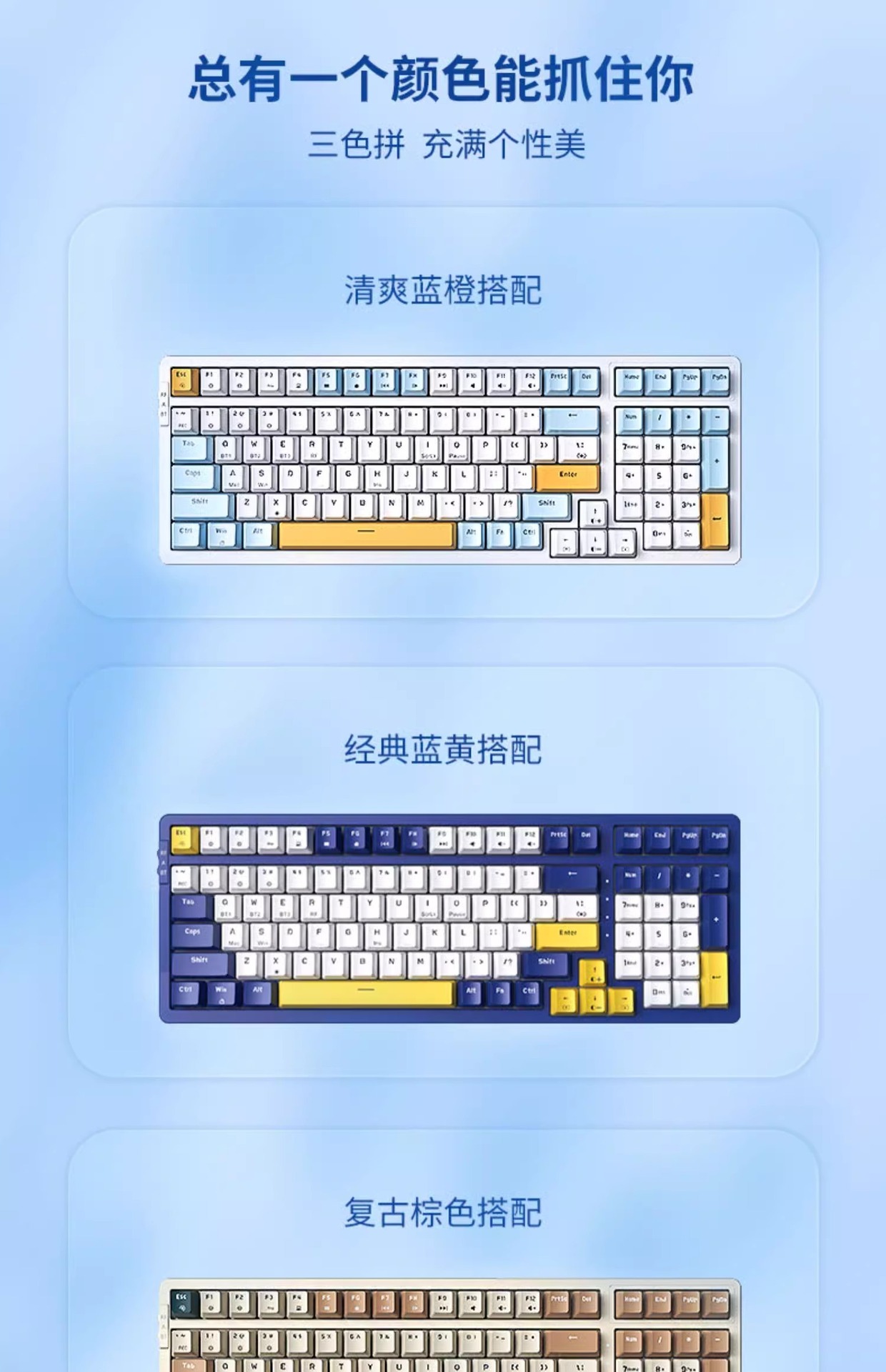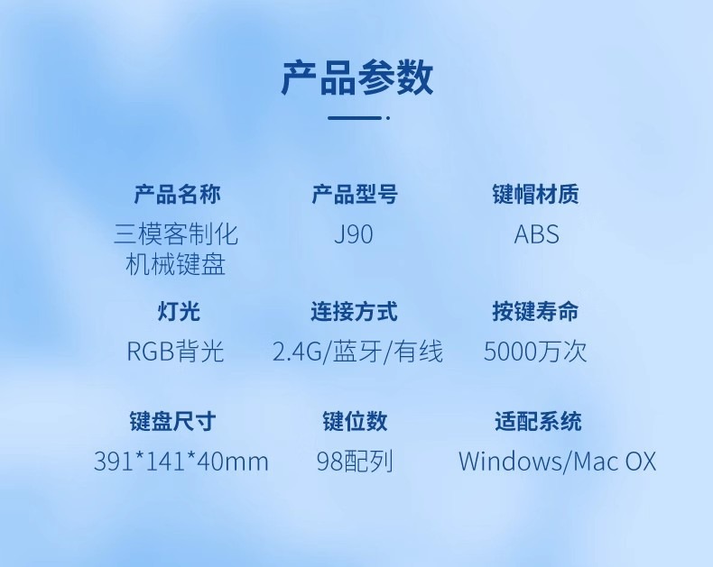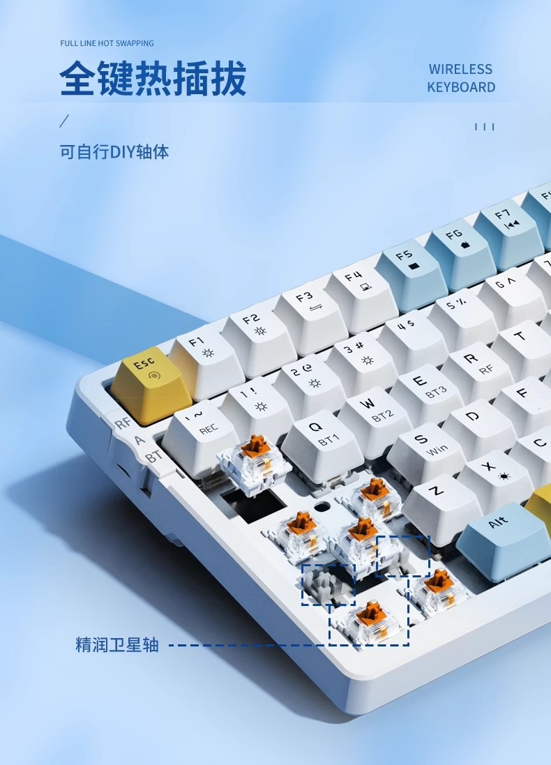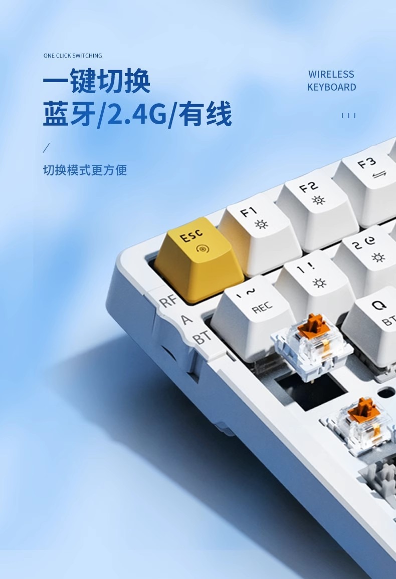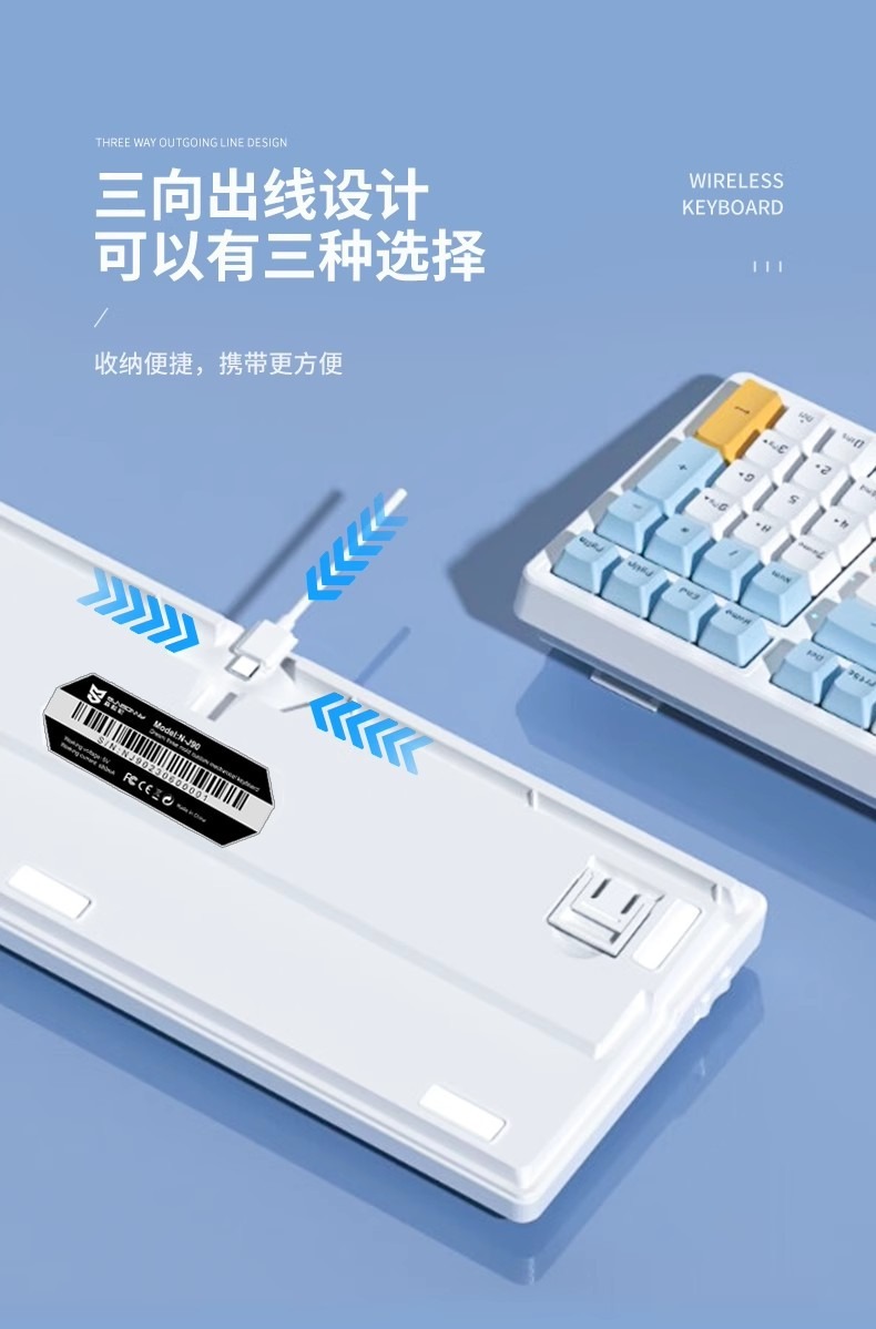 颜色 J80天空白蓝-蓝光【青轴】,J80天空白蓝-蓝光【茶轴】,J80天空蓝白-蓝光【红轴】,J80咖啡白棕-橙光【茶轴】,J80咖啡棕白-橙光【红轴】,J80黑加仑紫白-蓝光【红轴,J80黑加仑白紫-蓝光【茶轴】,NJ90海盐-蓝光【金茶轴】无线/蓝牙/有线三模,NJ90机甲-蓝光【水蜜桃轴】无线/蓝牙/有线三模,NJ90露营印记-混光【冰魄青轴】无线/蓝牙/有线
