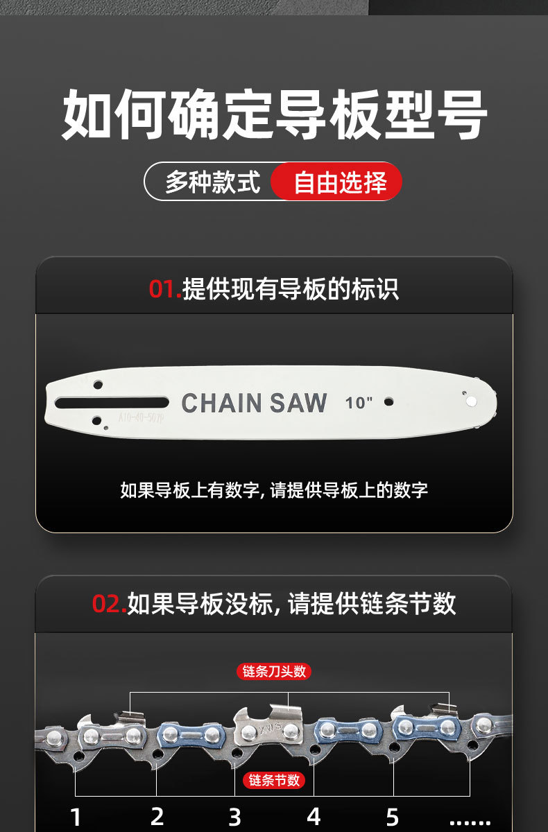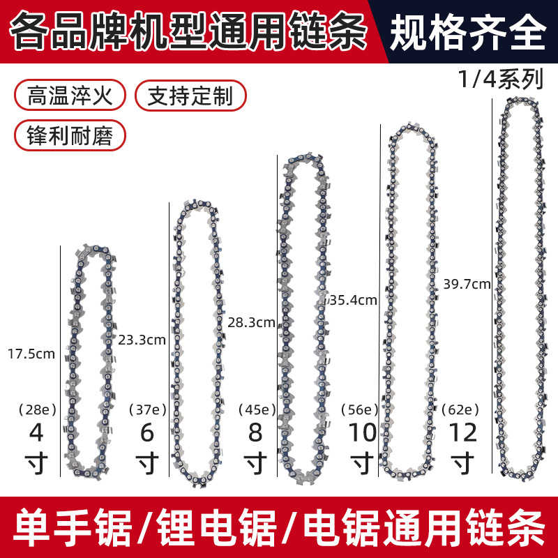规格 小4 4寸链条28节,小4 4寸导板28节,4寸链条+导板28节,小4 6寸链条37节,小4 6寸导板37节,6寸链频+导板37节,小4 8寸链条45节,1/4 8寸导板45节,8寸链条+导板45节,1/4 8寸链索48节,1/4 8寸导板48节,8寸链条+导板48节,1/4 10寸链条56节,1/4 10寸导板56节,10寸链条+导板56节,1/4 12寸链条62节,1/4 12寸导板62节,12寸链条+导板62节,3/8 8寸链条33节,3/8 8寸导板33节,8寸链条+导板33节,10寸链条40节,10寸导板40节,10寸链条+导板40节,3/8 12寸链条45节,3/8 12寸链条黄金直角45节,3/8 12寸导板45节,12寸链象+导板45节,16寸电锯链条59节,3/8 16寸链条59节直角,16寸电锯导板59节,16寸电锯链条+导板59节,16寸油锯链条64节圆角,16寸油锯链条 64节直角,16寸油据导板64节,18寸油据链条72节圆角,18寸油据链条72节直角,18寸油锯导板72节,20寸油锯链条76节圆角,20寸油锯链条76节直角,20寸油锯导板76节,20寸油锯链条68节