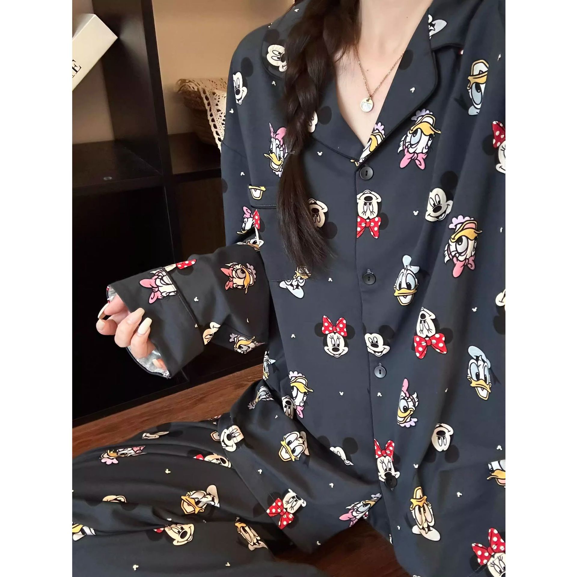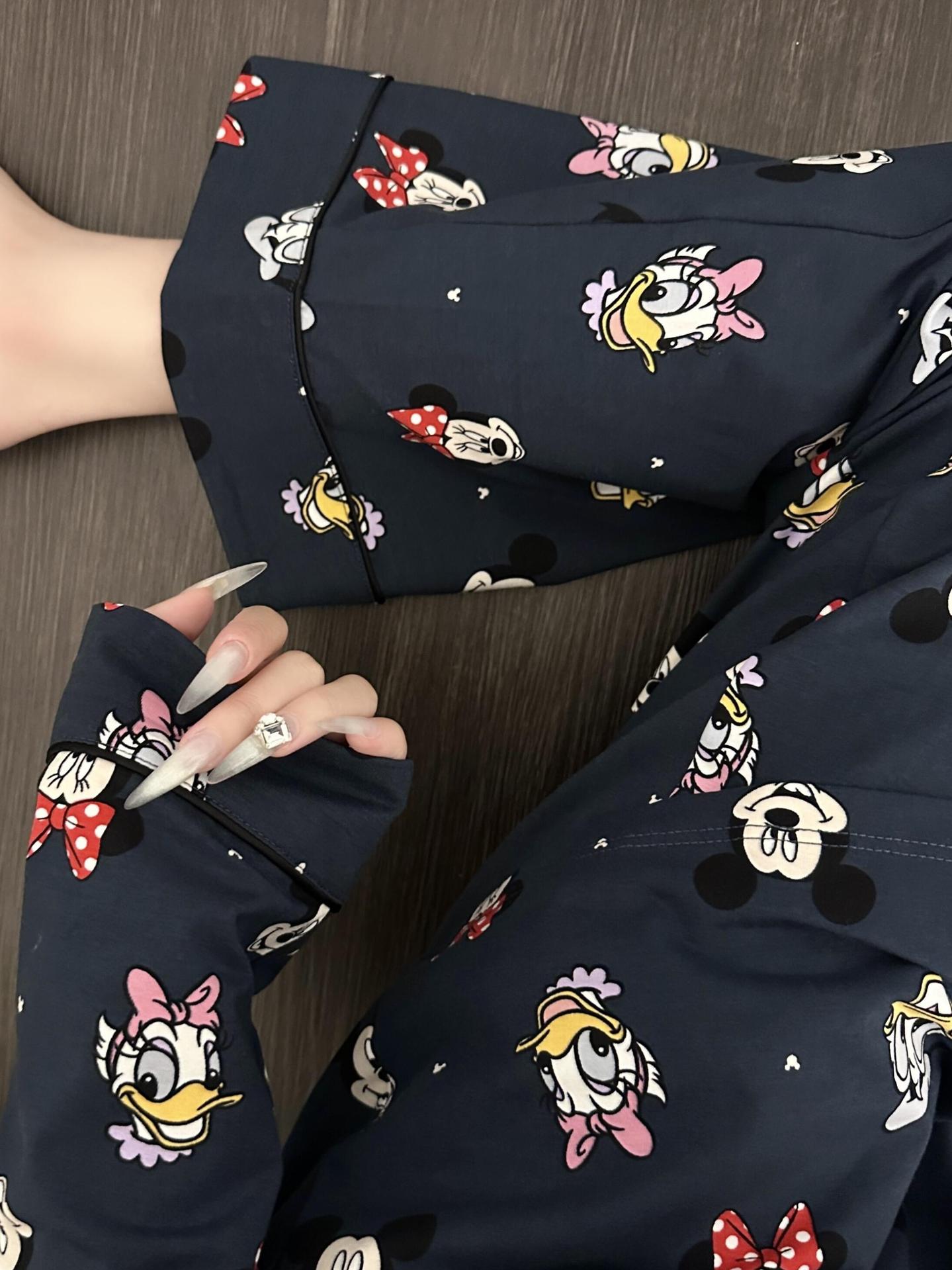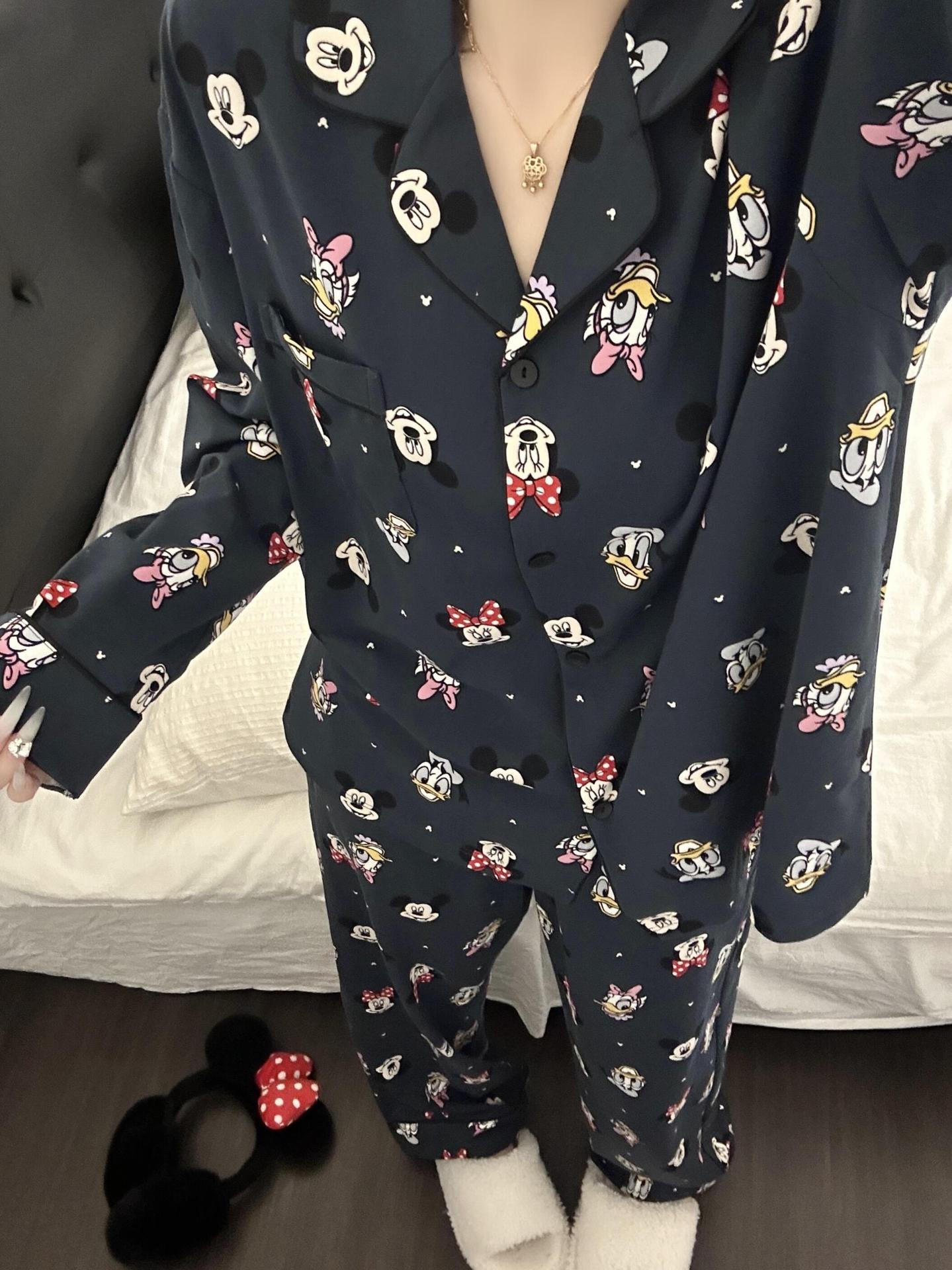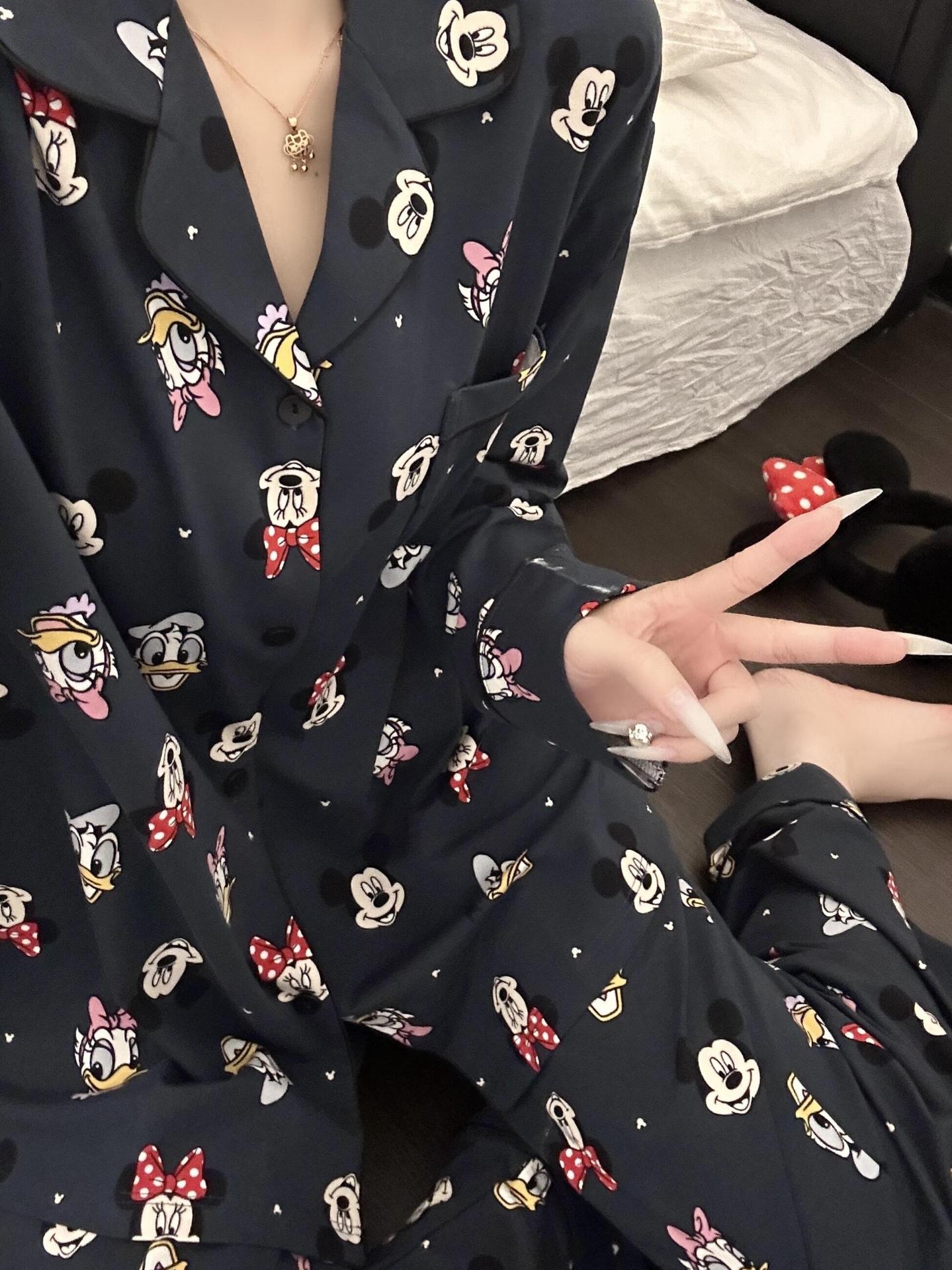柔らかいモチモチの肌のミッキーのパジャマの女性の氷の糸の春夏の新型の2025漫画の長袖のズボンの部屋の服の2つのセットのスーツ