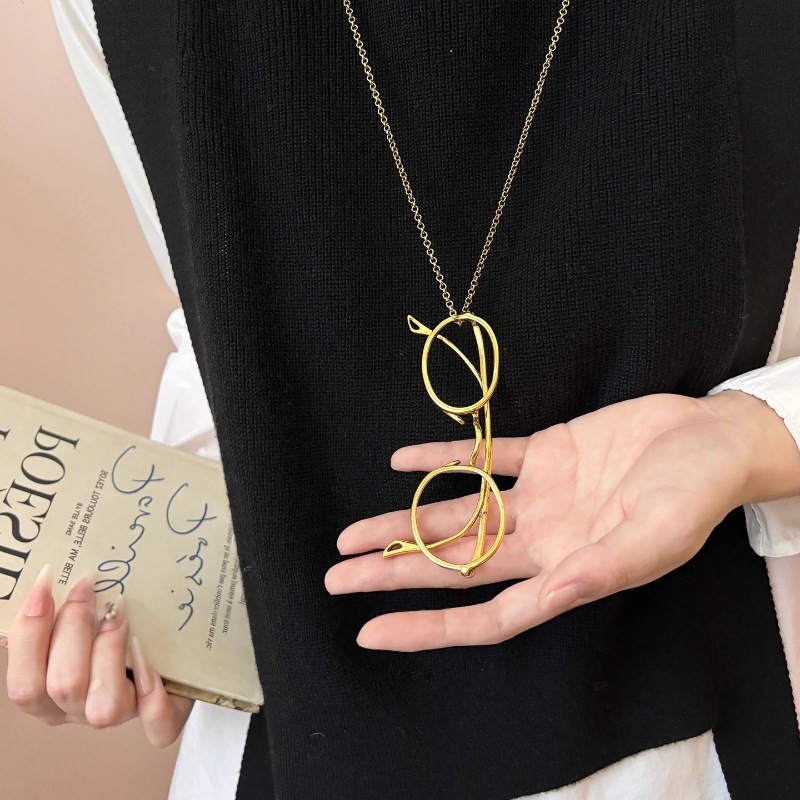 时髦复古做旧眼镜吊坠项链古金古银眼镜造型挂绳长项链毛衣链配饰