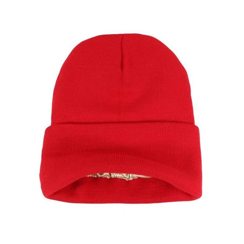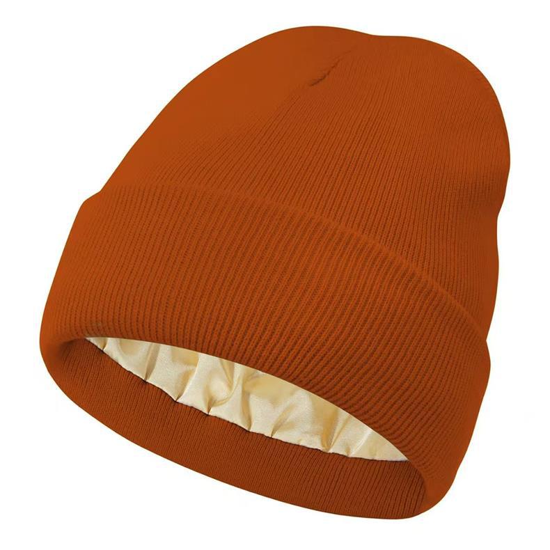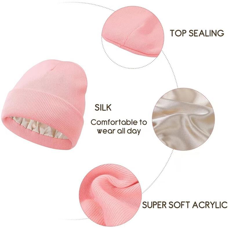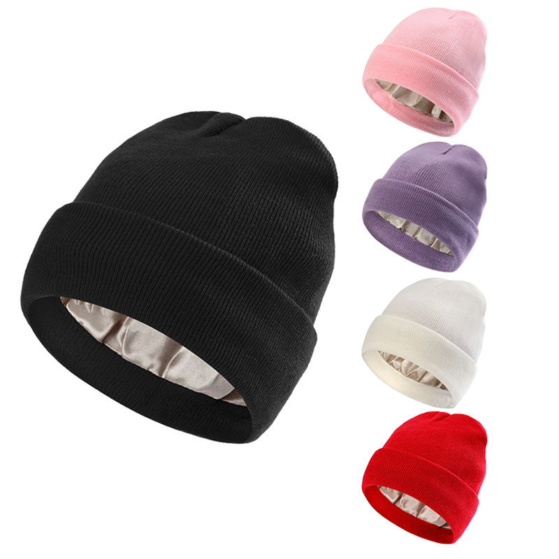 秋冬丝绸内里针织帽定制logo刺绣跨境女士保护发型保暖御寒毛线帽