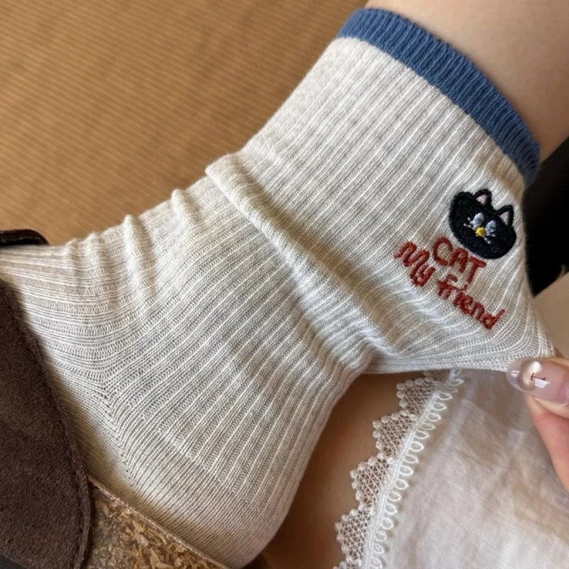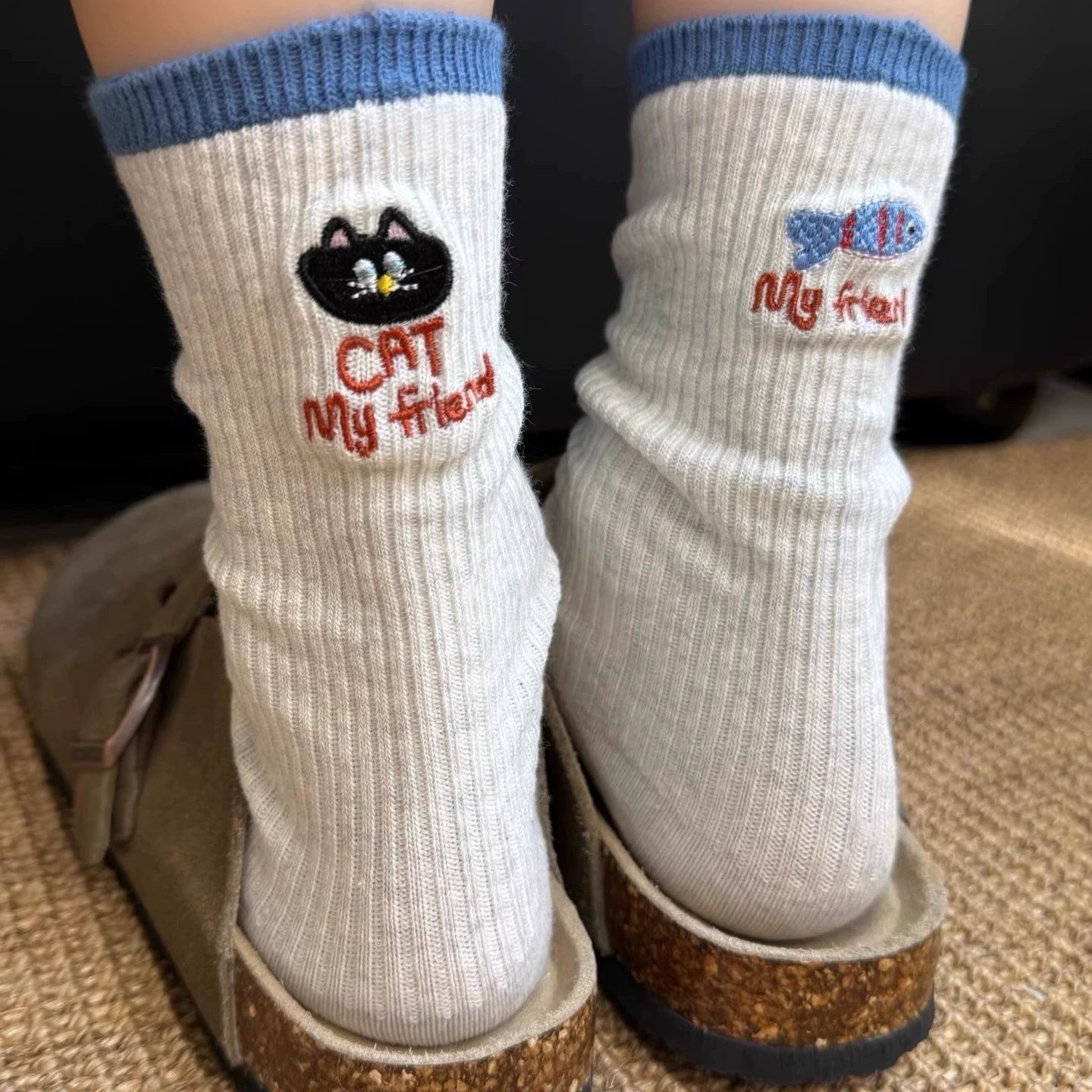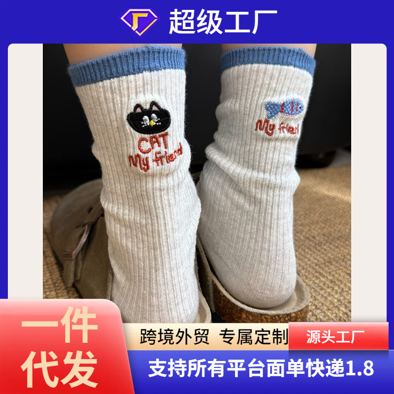 秋季新款刺绣小猫与鱼袜子女早秋卡通可爱风中筒袜堆堆袜亲肤潮流