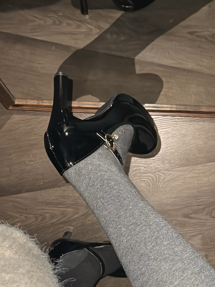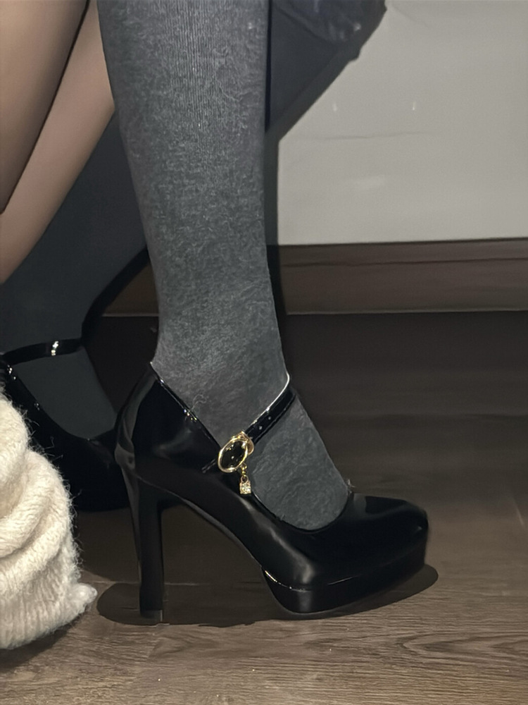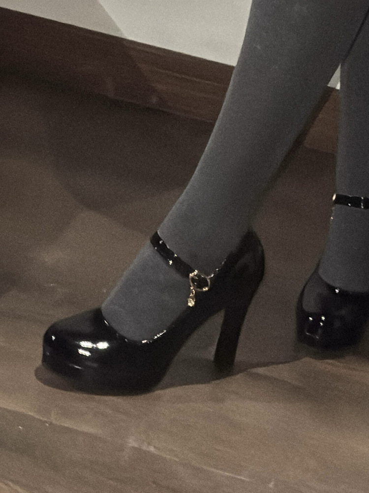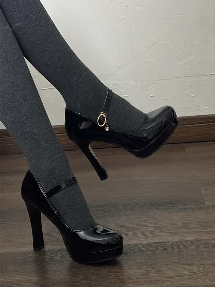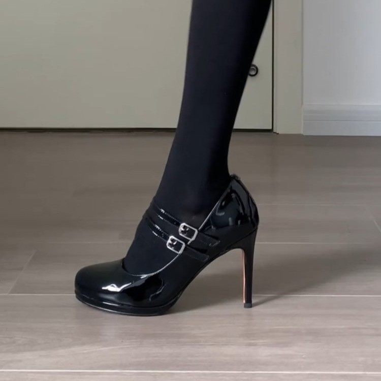 【在庫あり】高級ブラックパテントレザー気質シングルシューズ女性用春秋フレンチラウンドトゥメリージェーンハイヒール太いヒール