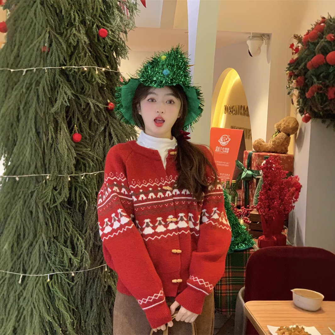 日本のレトロな牛の角のボタンのセーターのコートの女性の秋冬の新型の雰囲気感のクリスマスの百合の洋風のニットのカーディガン