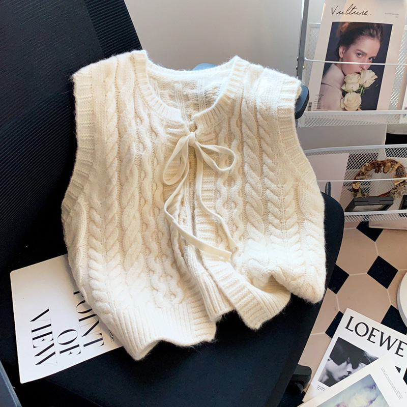 白色麻花绑带圆领针织马甲秋冬款无袖毛衣女叠穿坎肩背心洋气外穿