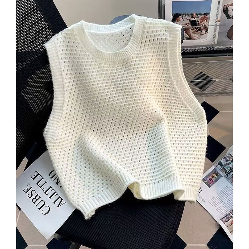 复古圆领镂空设计感针织马甲背心女秋季宽松叠穿外搭坎肩马夹上衣