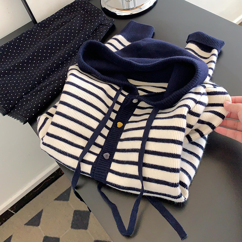 韩系撞色条纹连帽针织开衫女秋冬新款慵懒风宽松百搭休闲毛衣外套