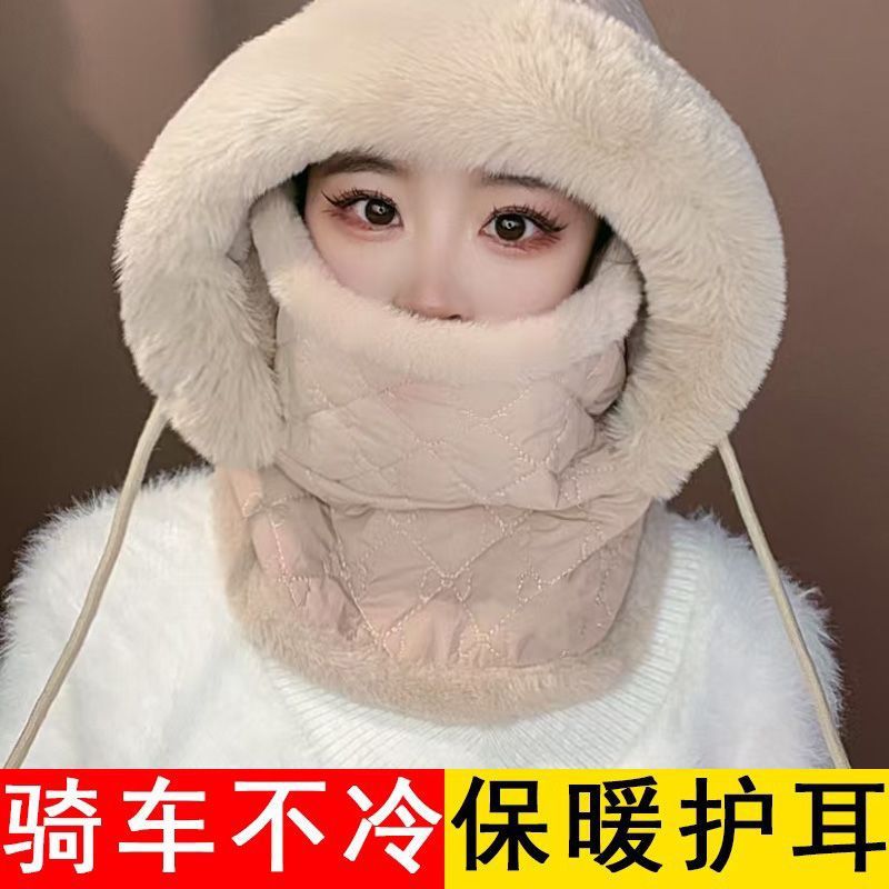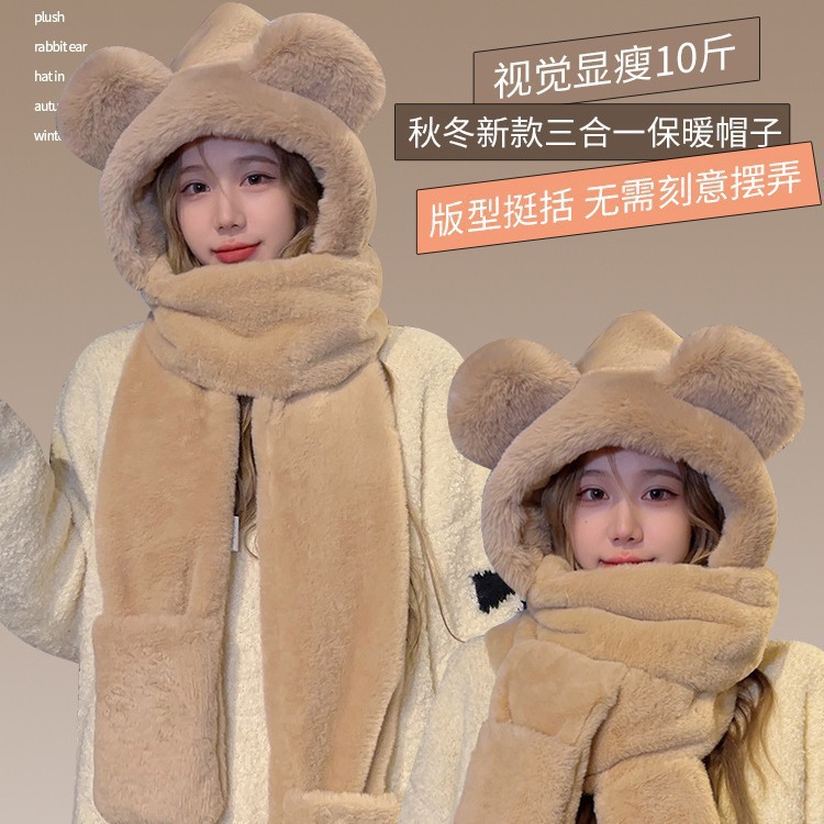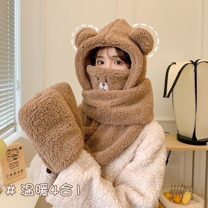 小熊保暖帽子连帽围巾手套一体护颈毛绒防寒防风帽三件套秋冬女