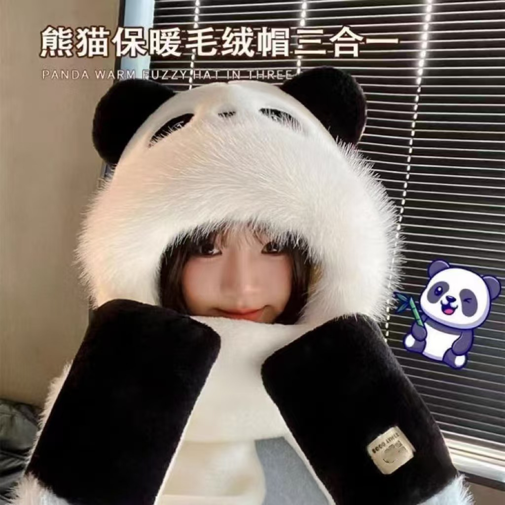 新款毛绒帽子冬季熊猫可爱一体三合一宝宝加厚保暖防寒围脖护耳