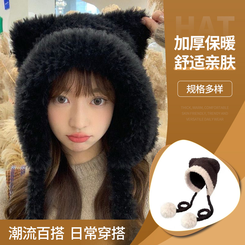 帽子女秋冬季可爱狐狸耳朵帽子围巾两件套毛绒帽骑车保暖护耳帽子