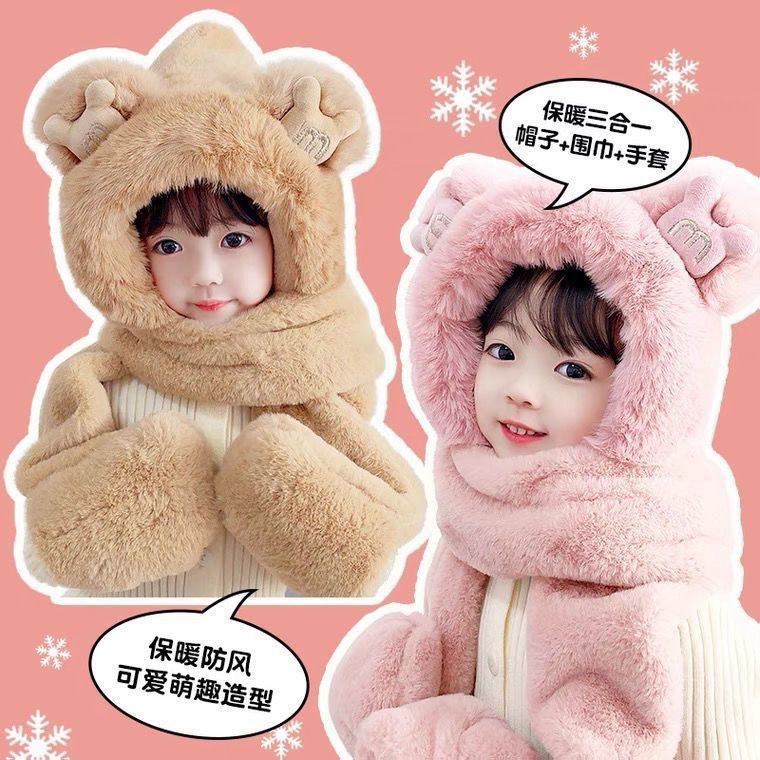 儿童帽子围巾手套一体秋冬季男女童毛绒三件套宝宝头套款加厚保暖