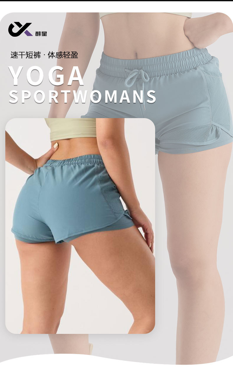 新型の光防止運動フィットネス半ズボンの女性のゆったりしたネットの糸は偽の2つの速乾のズボンのヨガの半ズボンの欧米をつなぎ合わせます。