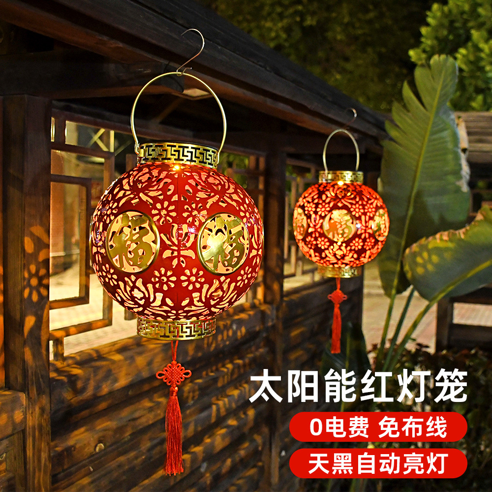 太阳能铁艺牡丹红灯笼春节喜庆大门布置装饰灯过年阳台福字庭院灯