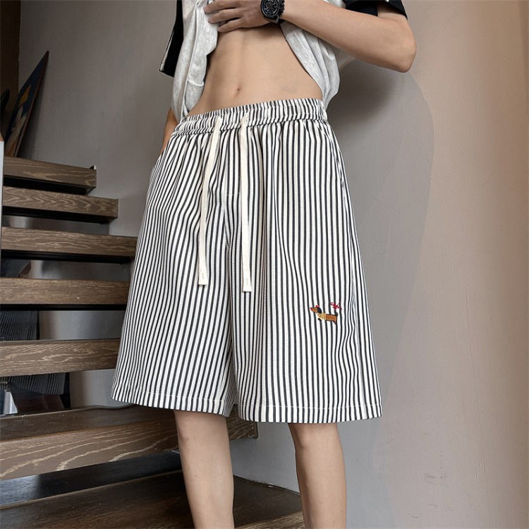 アメリカンストライプダックスフント刺繍ショーツメンズ夏薄氷感大きいサイズゆったりスポーツカジュアルミッドパンツ