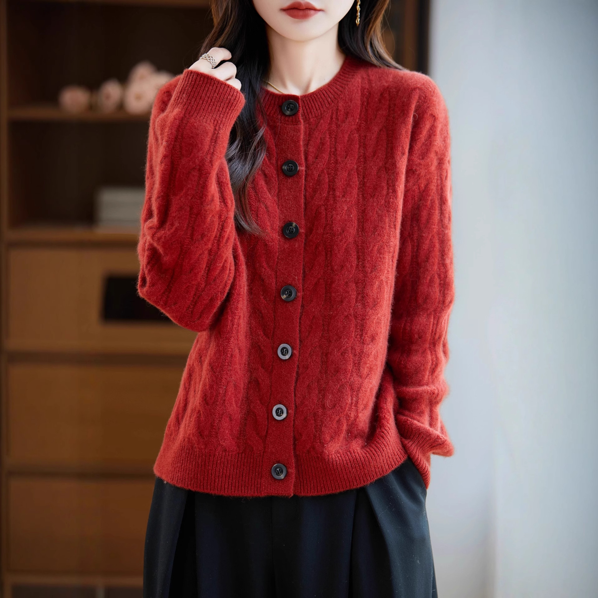 100%羊毛加厚大麻花黑扣开衫经典绞花肌理黑扣点缀秋冬百搭针织款