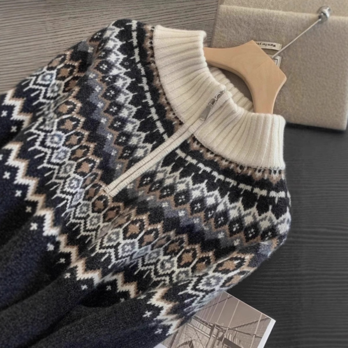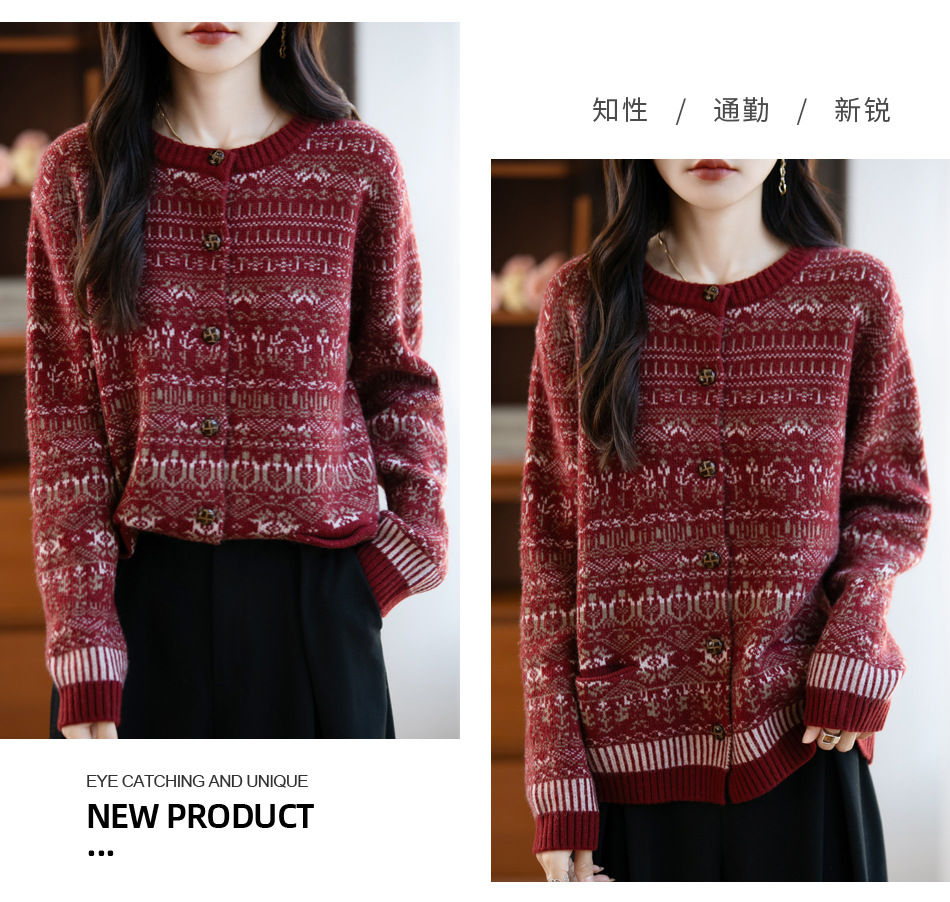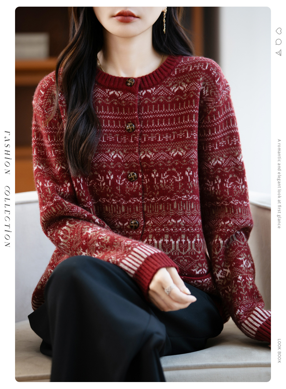精纺羊毛费尔岛毛衣 半高领半开门襟 北欧风提花 秋冬复古针织衫