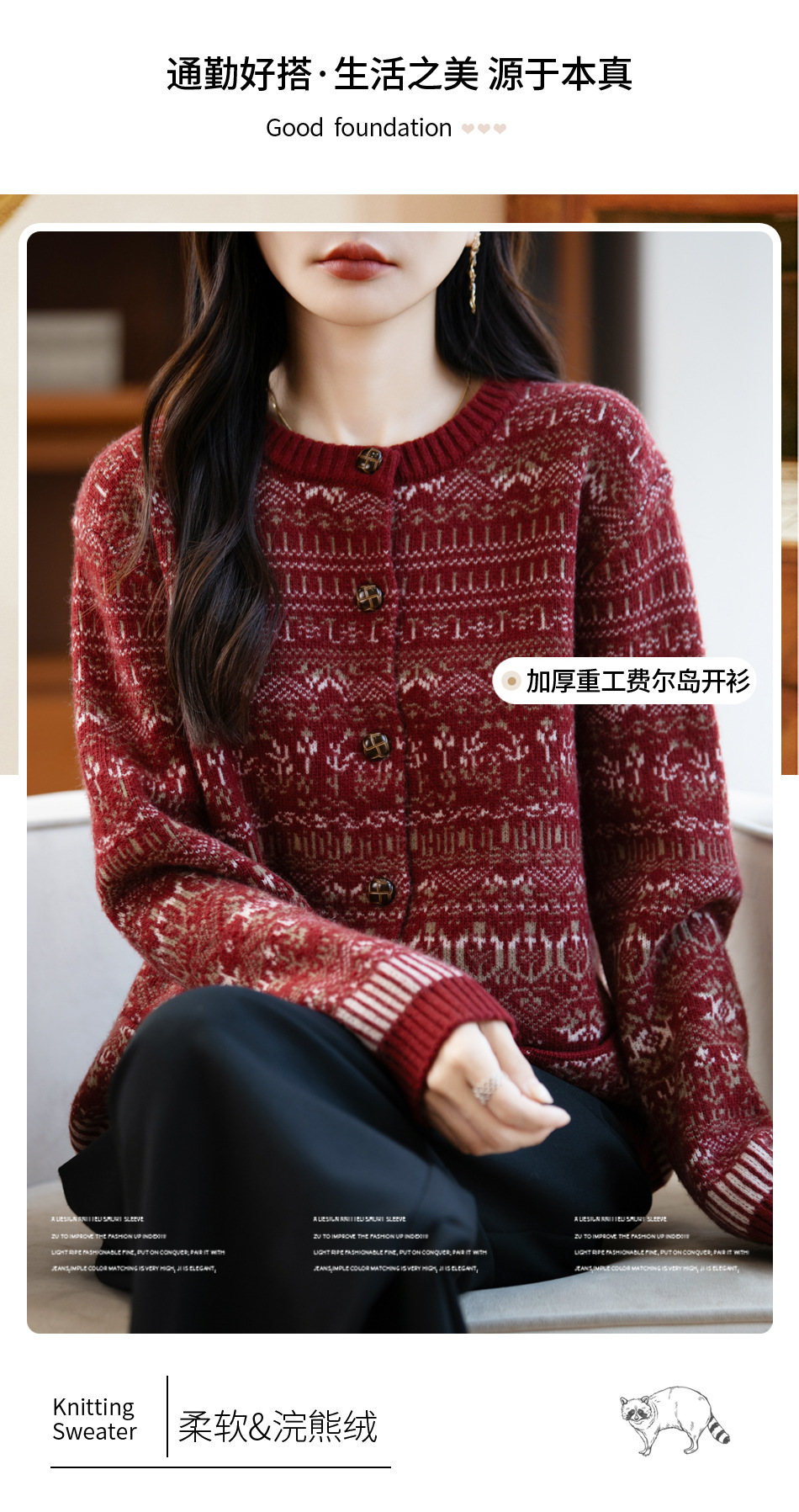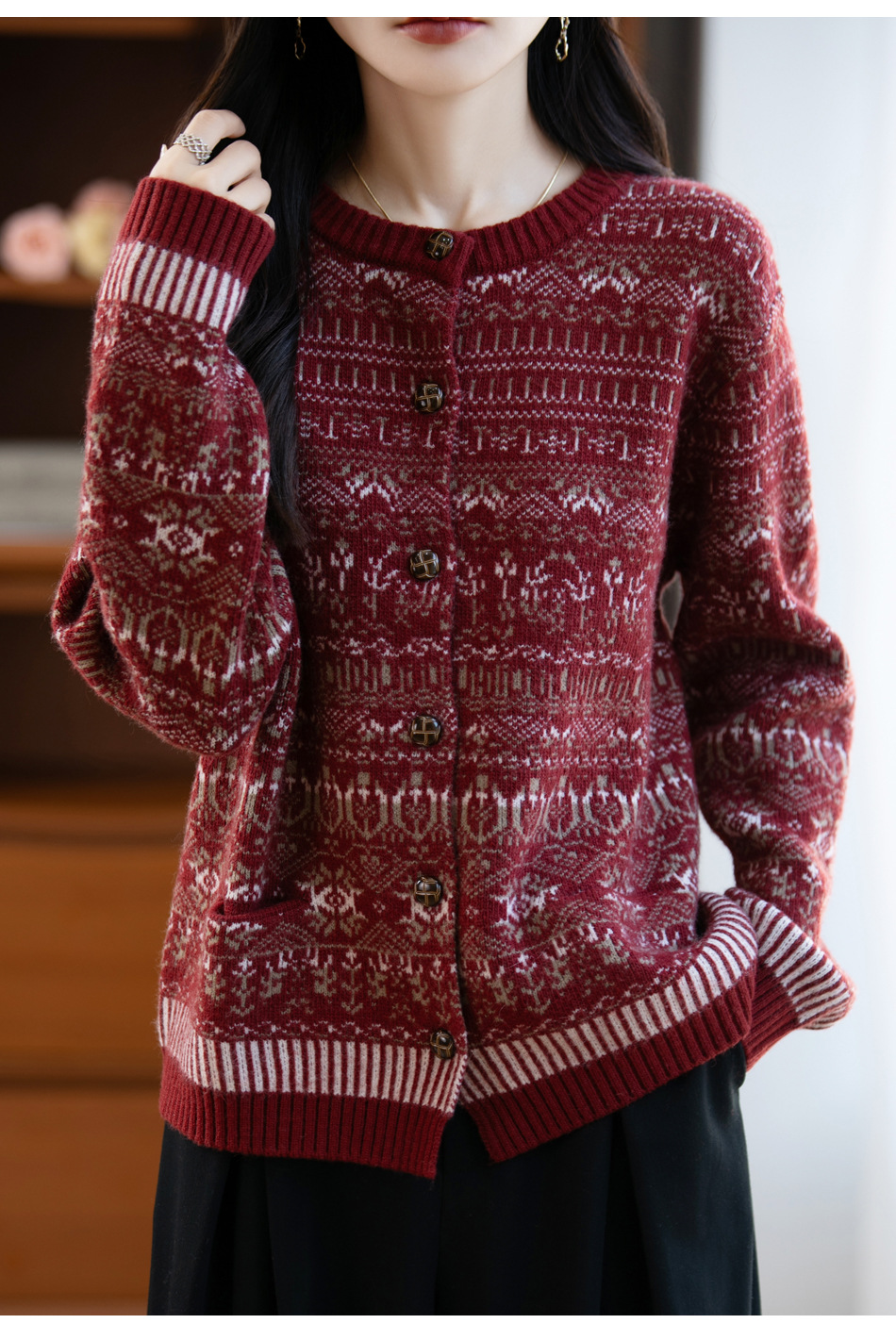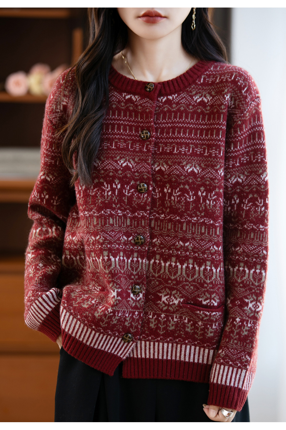 精纺羊毛费尔岛毛衣 半高领半开门襟 北欧风提花 秋冬复古针织衫
