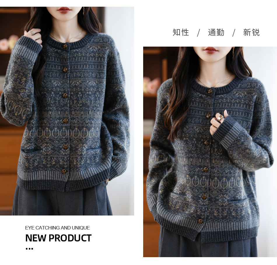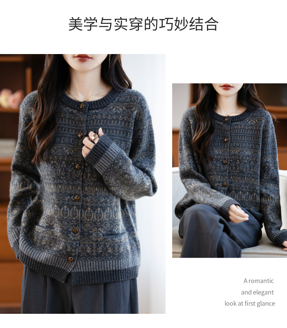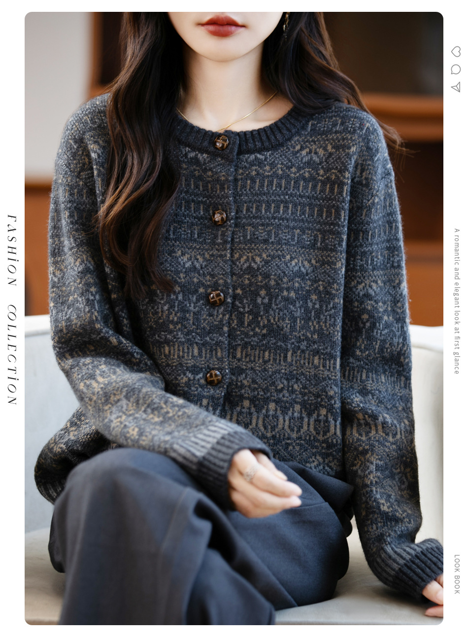 100%纯羊毛加厚卷边彩点纱开衫女 秋冬新款复古宽松慵懒外搭上衣