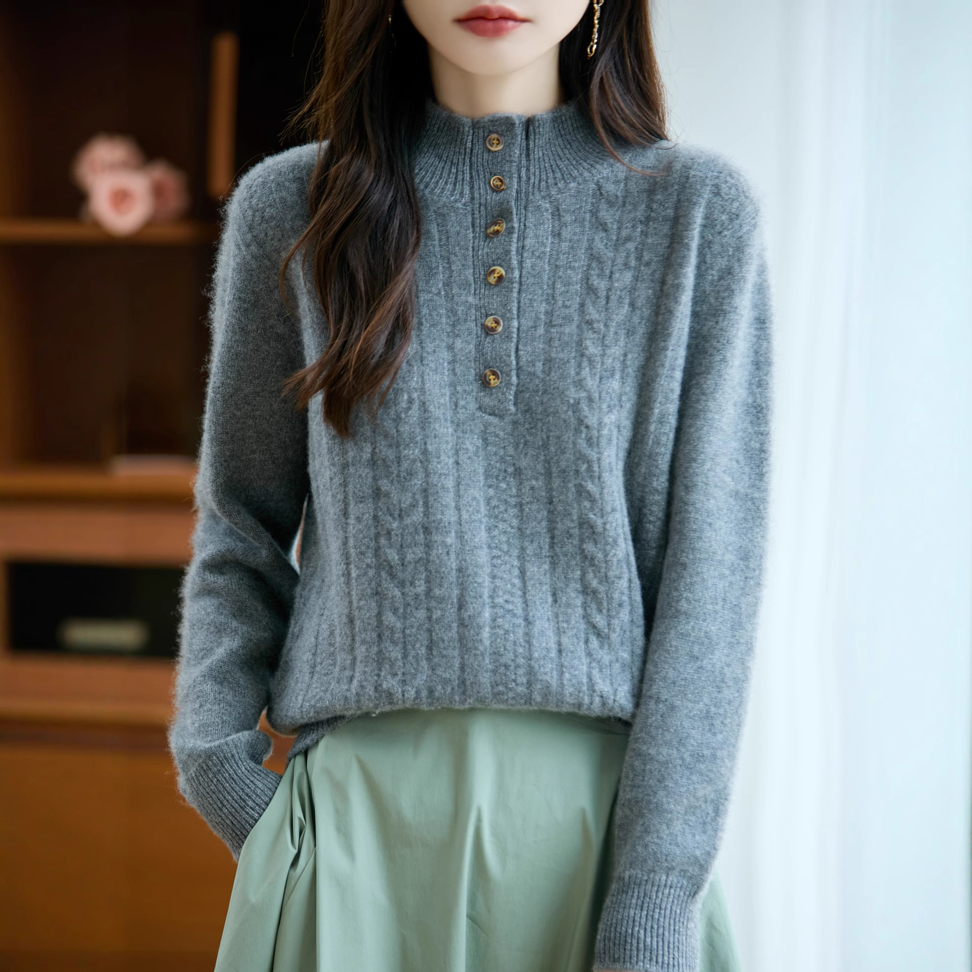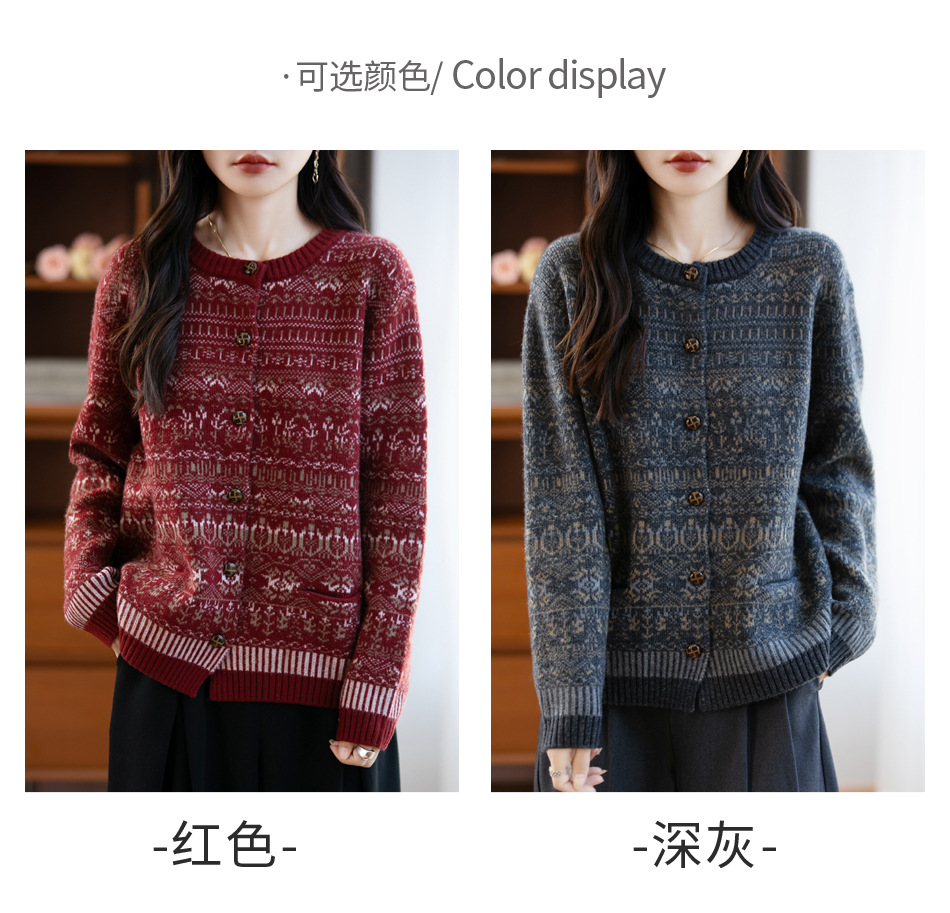 重磅100%羊毛毛衣七针加厚扭花羊毛衫女半开扣复古宽松外套