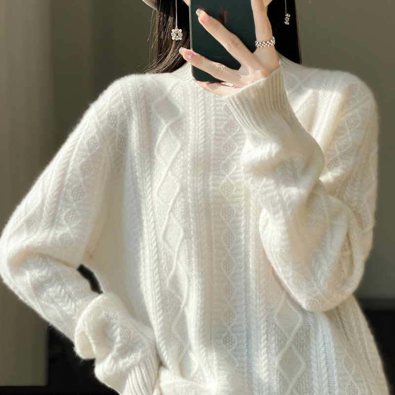 秋冬の新型の一線の成衣の透かし彫りの半高襟の女性の長袖のニットはゆったりしていて着痩せしています。