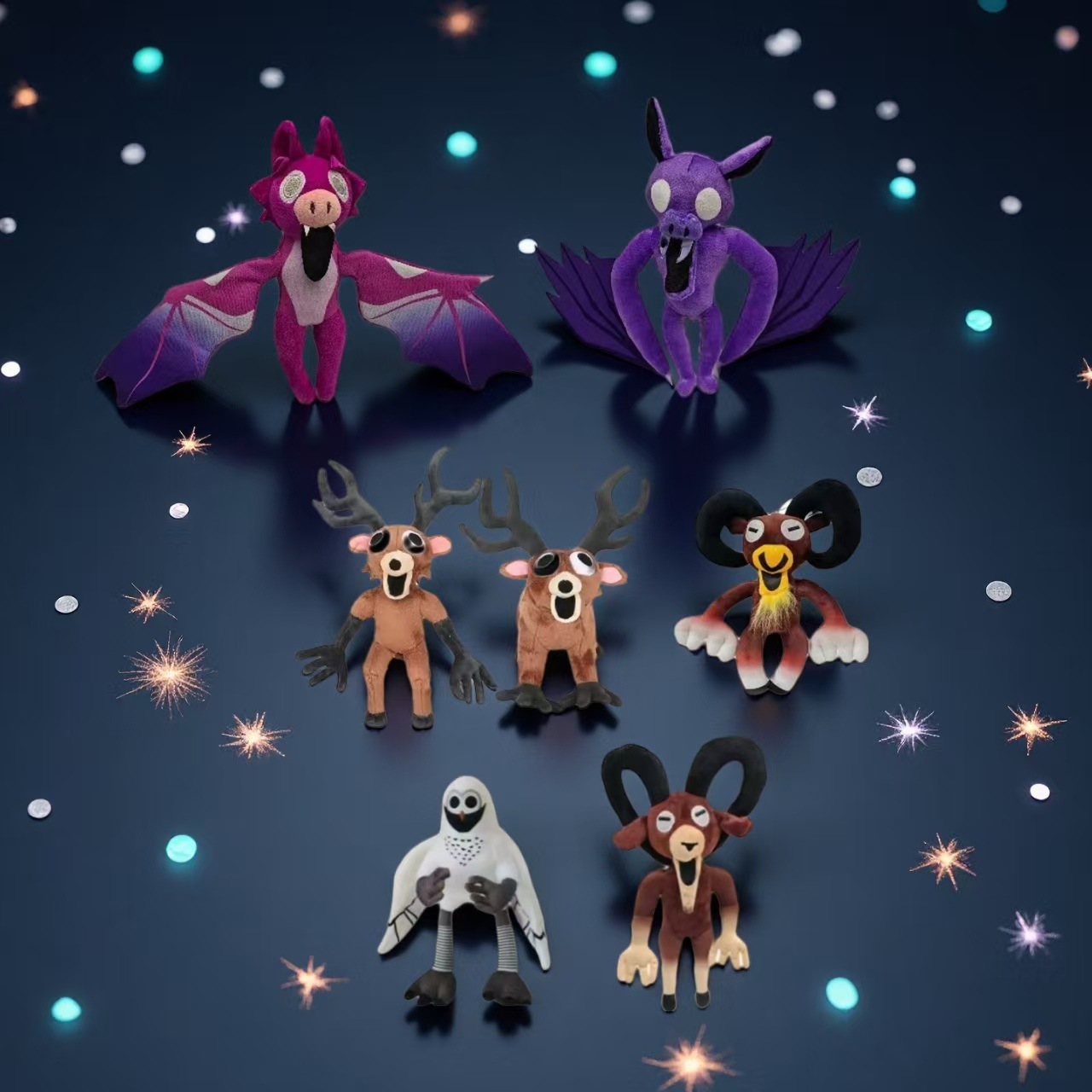 颜色 胡子大角山羊28厘米120克,Q版坐鹿25厘米105克,40厘米110克大紫蝙蝠,30厘米70克小紫蝙蝠,红帽子方块人27厘米111克,站姿鹿行怪物35厘米130克,趴姿鹿行怪物30厘米130克,白色鹰30厘米135克,变异鹿35厘米120克