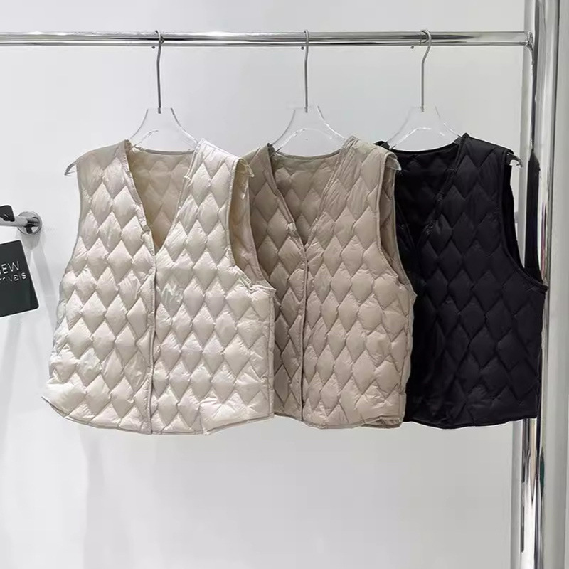 秋冬新作菱形格雲朵柄レディースショートダウンベスト、おしゃれなVネックインナーベスト、軽量ベストジャケット