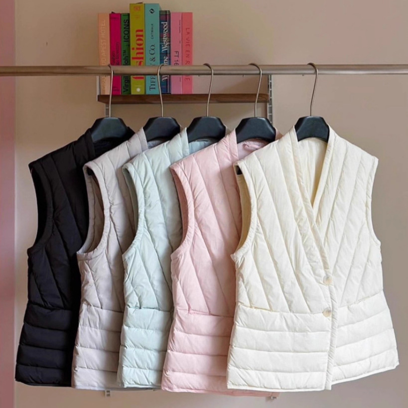 跨境TikTok无领内胆女士马甲V领轻薄羽绒服保暖外套大码坎肩背心