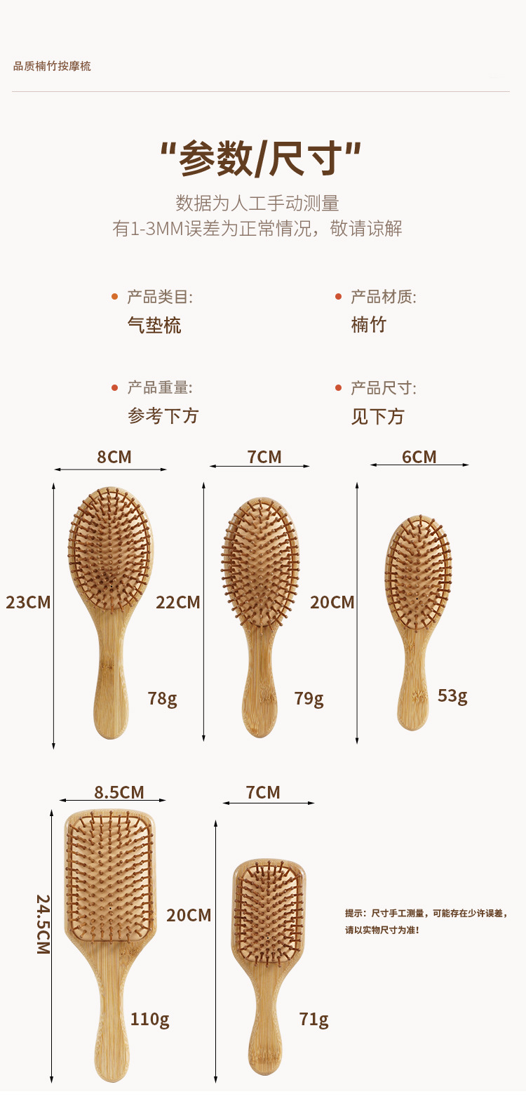 规格 楠竹方形气垫梳【小号】,楠竹椭圆气垫梳【小号】,楠竹椭圆气垫梳【中号】,楠竹椭圆气垫梳【大号】,楠竹方形气垫梳【大号】