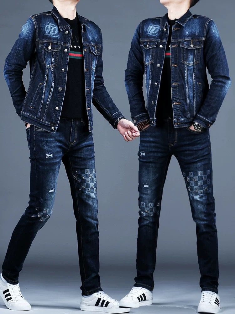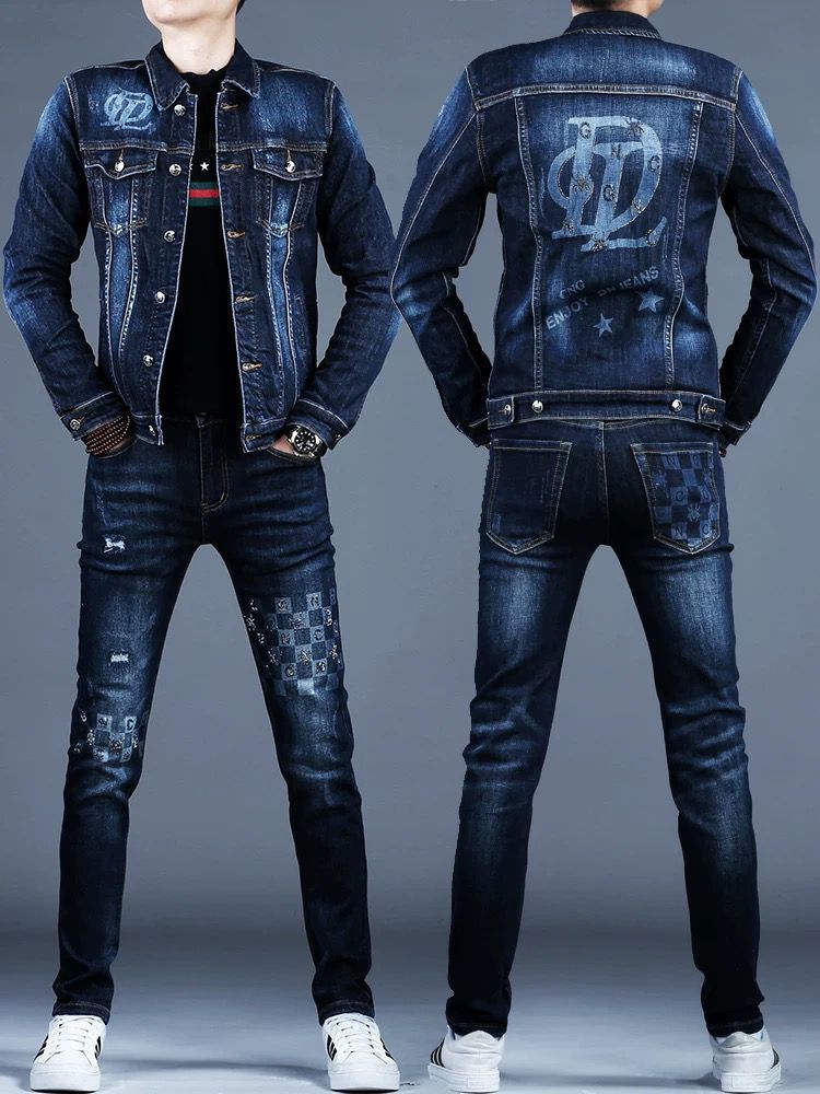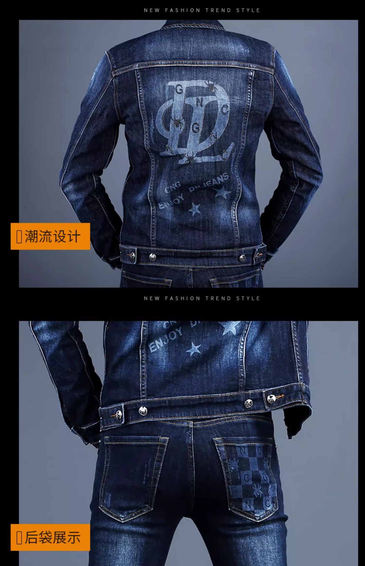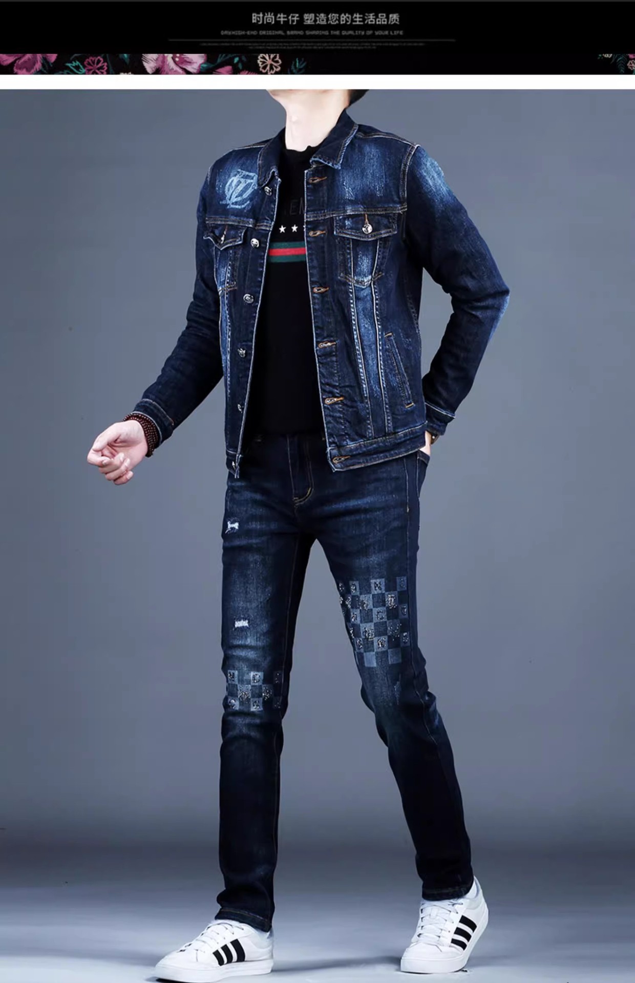 2025新款烫钻牛仔套装男士裤子潮流小脚修身牛仔外套秋冬欧版