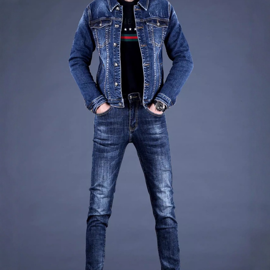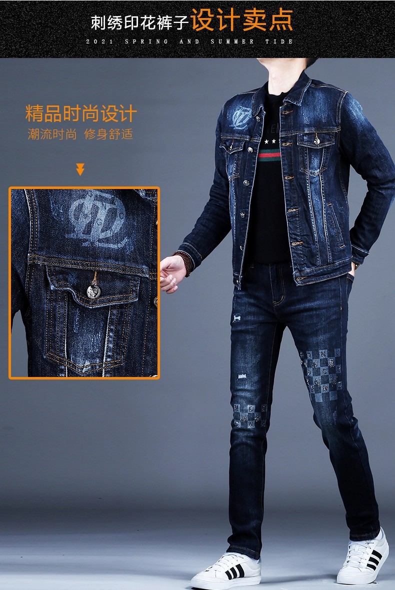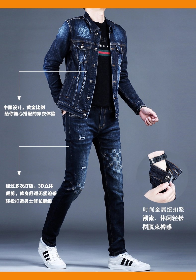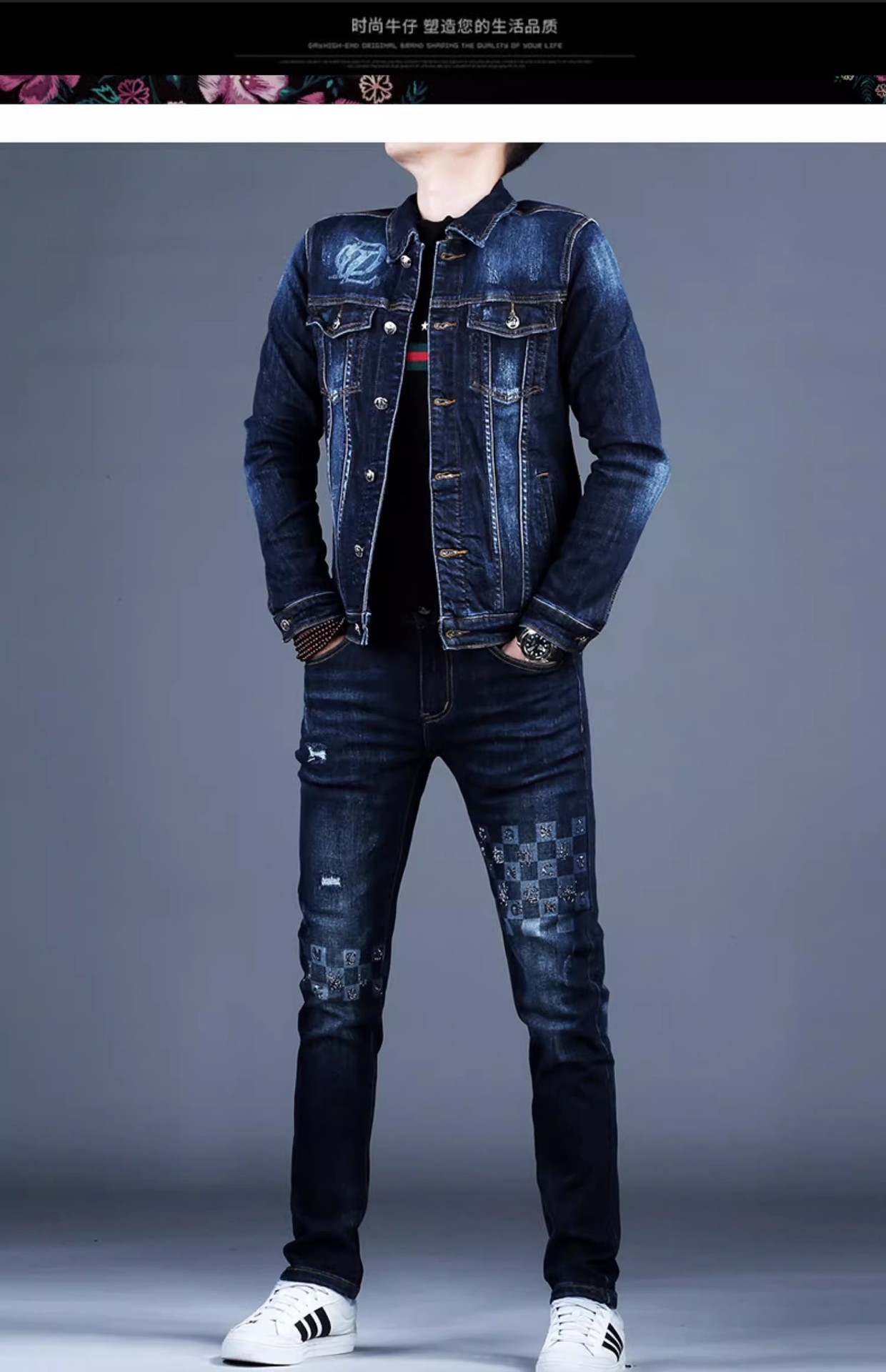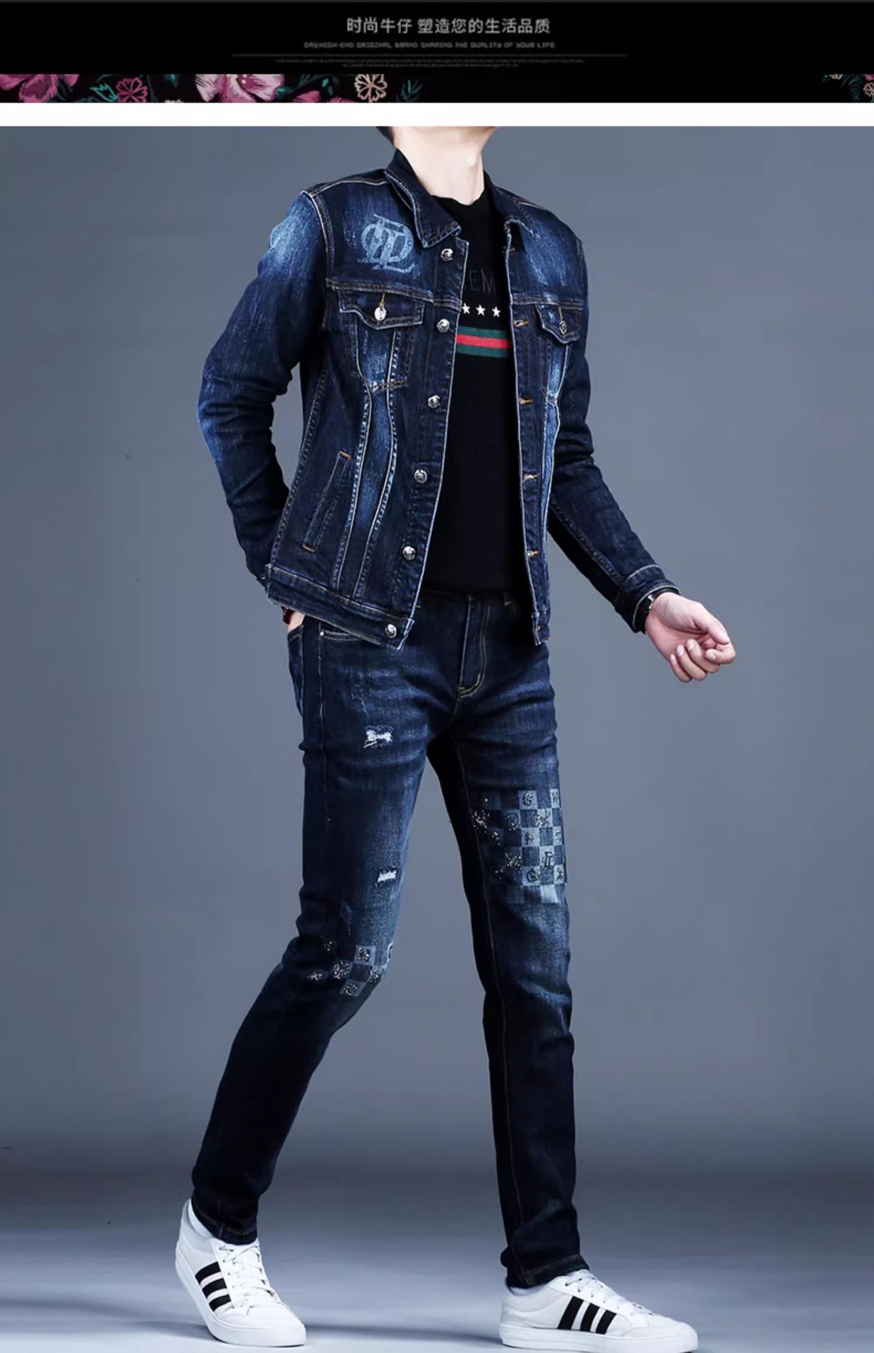 2025新款烫钻牛仔套装男士裤子潮流小脚修身牛仔外套秋冬欧版