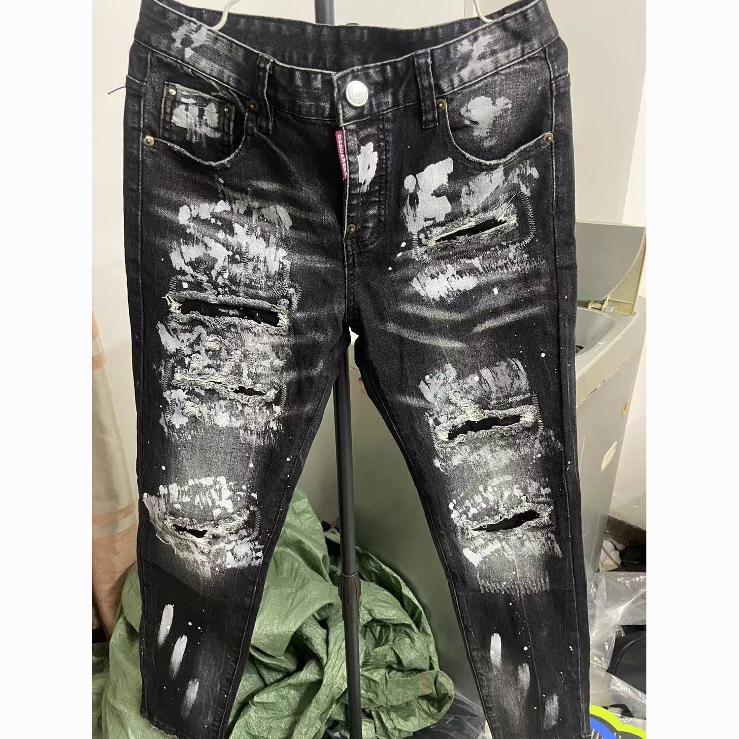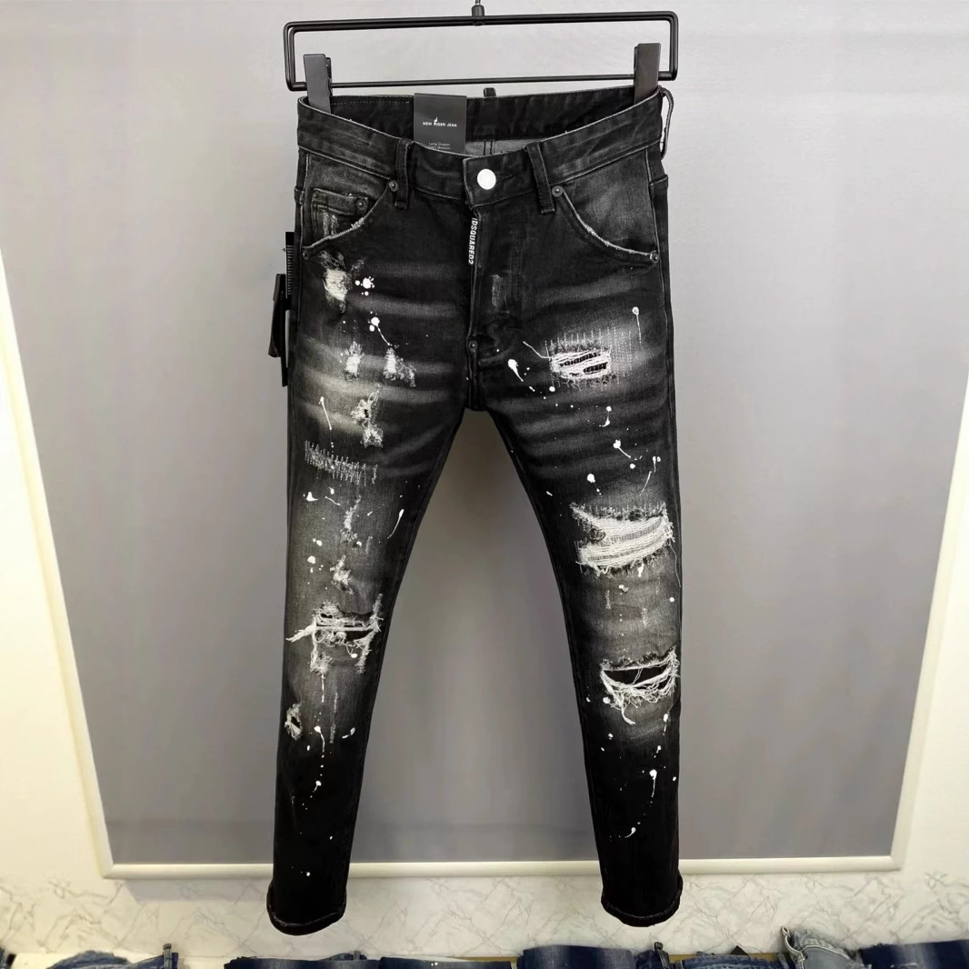 2025春夏の新型D2潮男水洗い穴を割ってペンキを塗って足の黒いジーンズ男が街を爆破した